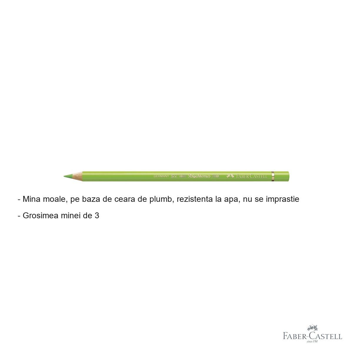 Daca esti artist, ilustrator sau pur si simplu pasionat de desen si doresti rezultate profesionale, creionul colorat Faber-Castell Polychromos in nuanta Vernil este alegerea ideala. Aceasta gama de creioane colorate este recunoscuta la nivel international pentru calitatea sa superioara, oferind artistilor controlul si precizia necesare pentru a crea lucrari de exceptie. Indiferent daca lucrezi pe hartie, carton sau alte suprafete compatibile, creionul Polychromos iti pune la dispozitie o culoare bogata, uniforma si durabila.