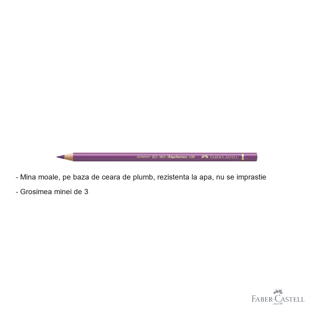 Unul dintre cele mai importante avantaje ale creionului Faber-Castell Polychromos este calitatea deosebita a pigmentilor utilizati. Acestia garanteaza atat stabilitatea culorii in timp, chiar si la expunerea prelungita la lumina, cat si intensitatea remarcabila a nuantei de violet roscat. Mina cu diametru de 3.8 mm este suficient de larga pentru a acoperi suprafete mai mari rapid, dar destul de precisa pentru detalii fine cand creionul este bine ascutit.