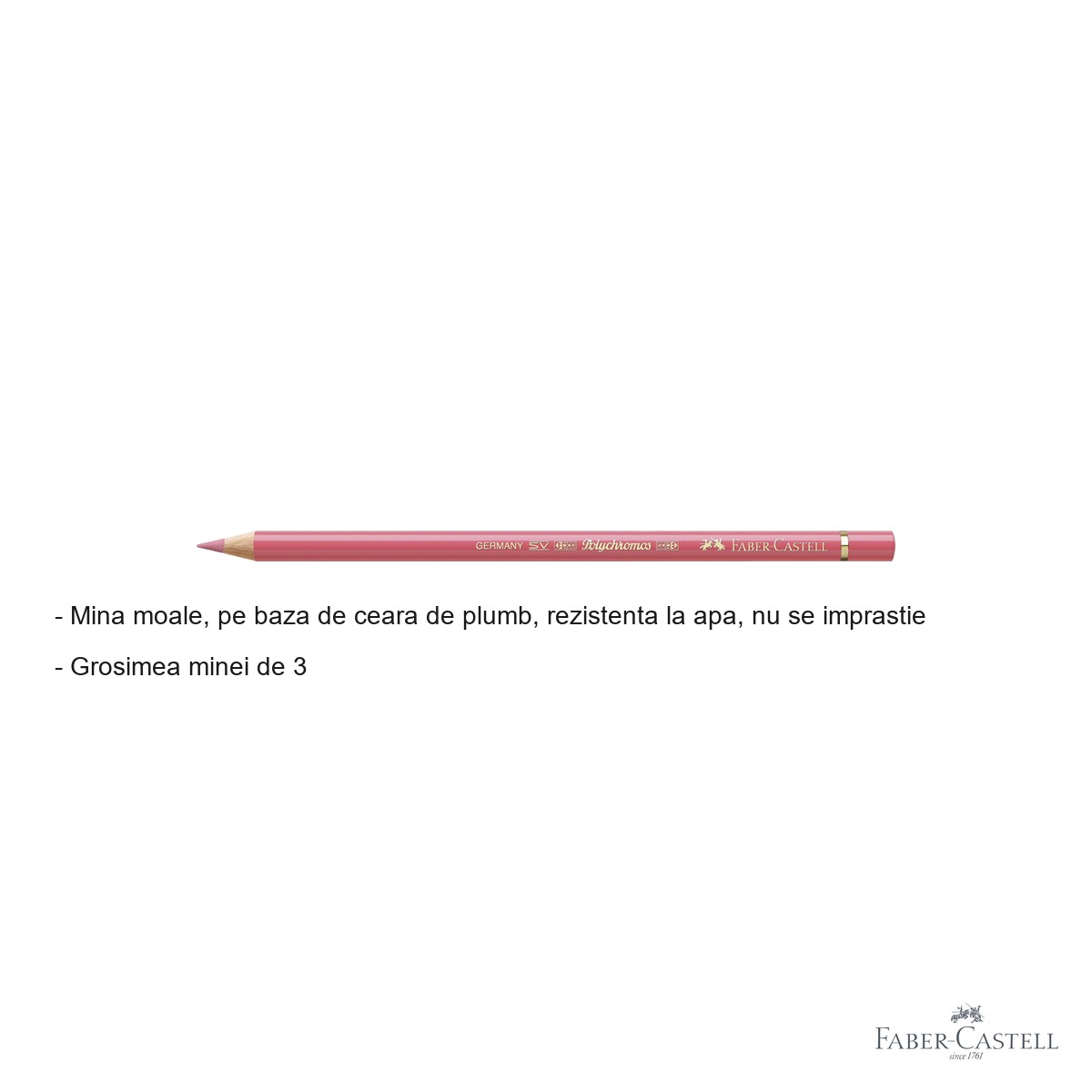 Creionul colorat Faber-Castell Polychromos Violet Roz este recomandat in special artistilor adulti si tinerilor din clasele superioare de arte plastice. Este parte dintr-o gama extinsa de culori Polychromos, astfel incat il poti completa cu alte nuante pentru a construi o paleta profesionala completa si armonioasa.