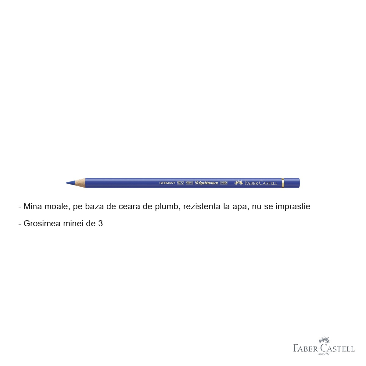 Se recomanda pastrarea creionului intr-un tub sau penar rigid pentru a evita ruperea minei in urma socurilor mecanice. Faber-Castell Polychromos este o gama premium recomandata artistilor profesionisti, ilustratorilor, studentilor la arte si tuturor pasionatilor de desen care doresc un standard ridicat al instrumentelor de lucru.