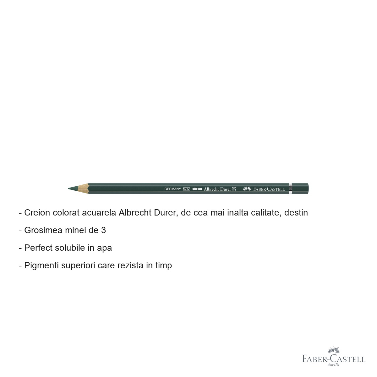Pentru artistii care cauta excelenta in materiale de arta, creionul colorat acuarela Albrecht Durer de la Faber-Castell reprezinta alegerea ideala. Nuanta verde pin 267 ofera posibilitati creative nelimitate, permitand trecerea cu usurinta de la tehnica uscata de desen la efecte spectaculoase de acuarela. Acest instrument de arta combina traditia de peste 250 de ani a brandului Faber-Castell cu tehnologia moderna a pigmentilor, rezultand un creion care satisface cerintele celor mai exigenti artisti profesionisti si amatori pasionati.