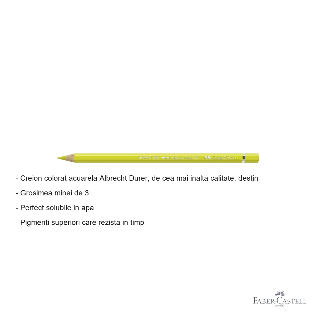 Pentru artistii care cauta versatilitate maxima in expresia artistica, creionul colorat acuarela Albrecht Durer reprezinta instrumentul ideal pentru a combina tehnicile de desen cu efectele spectaculoase ale acuarelei. Acest creion galben lamaie 205 face parte din gama premium Faber-Castell, fiind rezultatul a peste 250 de ani de experienta in productia de instrumente de arta.