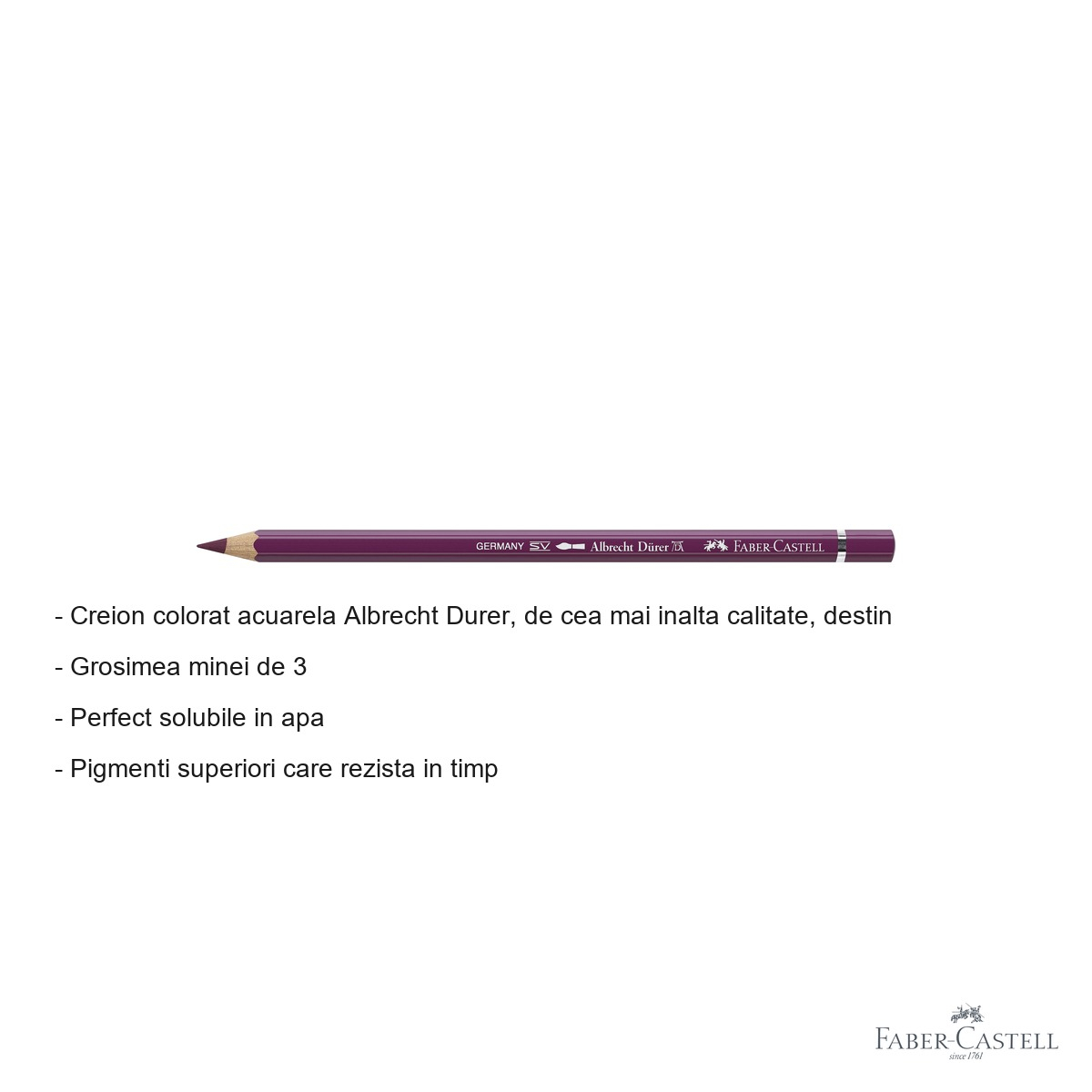 Creioanele colorate acuarela reprezinta instrumentul perfect pentru artistii care doresc sa combine precizia desenului cu fluiditatea picturii in acuarela. Creionul colorat acuarela Albrecht Durer de la Faber-Castell in nuanta magenta 133 ofera versatilitate maxima in exprimarea artistica, permitand trecerea usoara de la tehnica uscata la cea umeda prin simpla aplicare a apei.