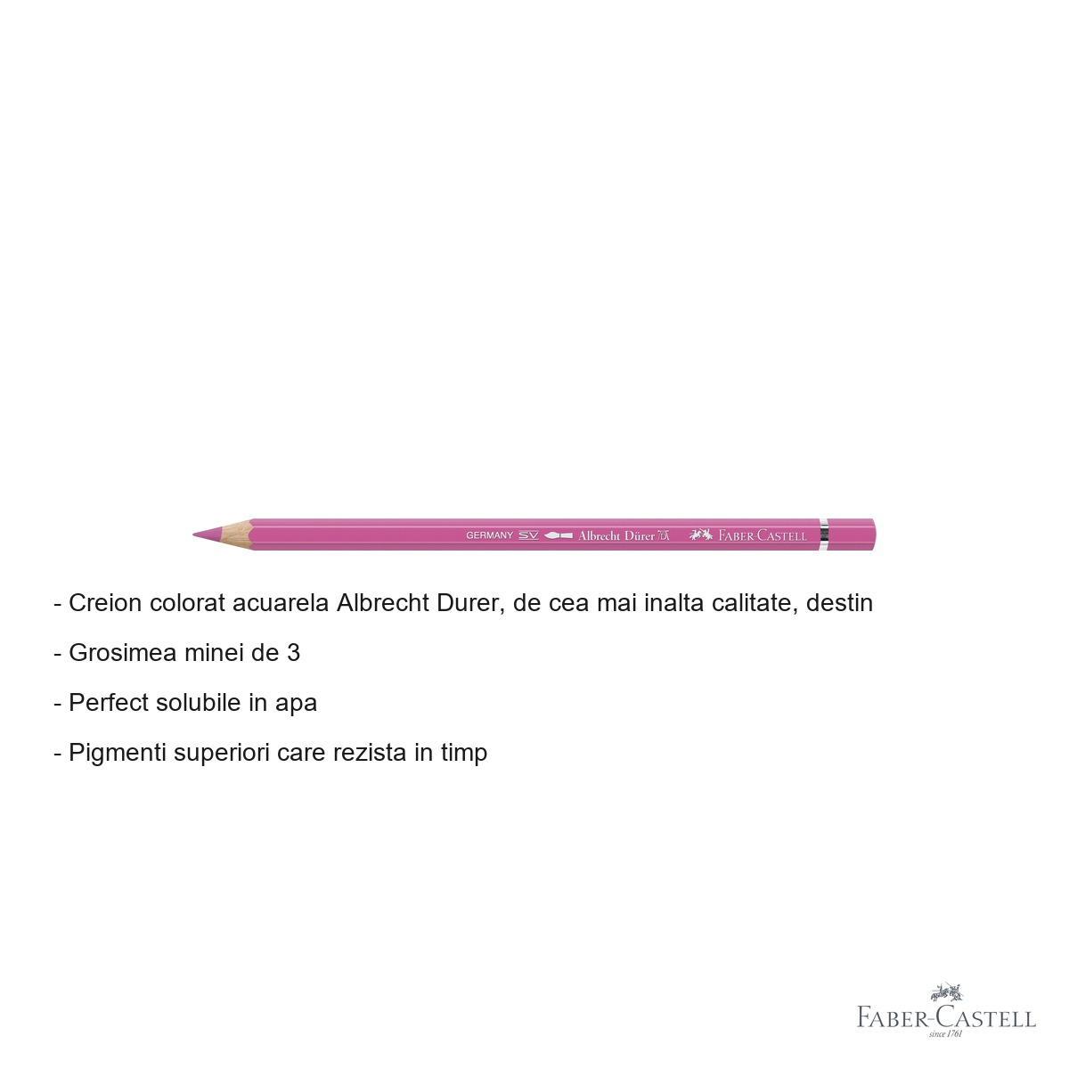 Pentru artistii care cauta versatilitate maxima in exprimarea creativa, creionul colorat acuarela Albrecht Durer de la Faber-Castell reprezinta instrumentul ideal. Culoarea roz stalactita 129 ofera o nuanta delicata si expresiva, perfecta pentru peisaje, portrete sau ilustratii botanice. Acest creion profesional combina precizia desenului cu fluiditatea picturii in acuarela, permitand trecerea usoara de la tehnica uscata la cea umeda.