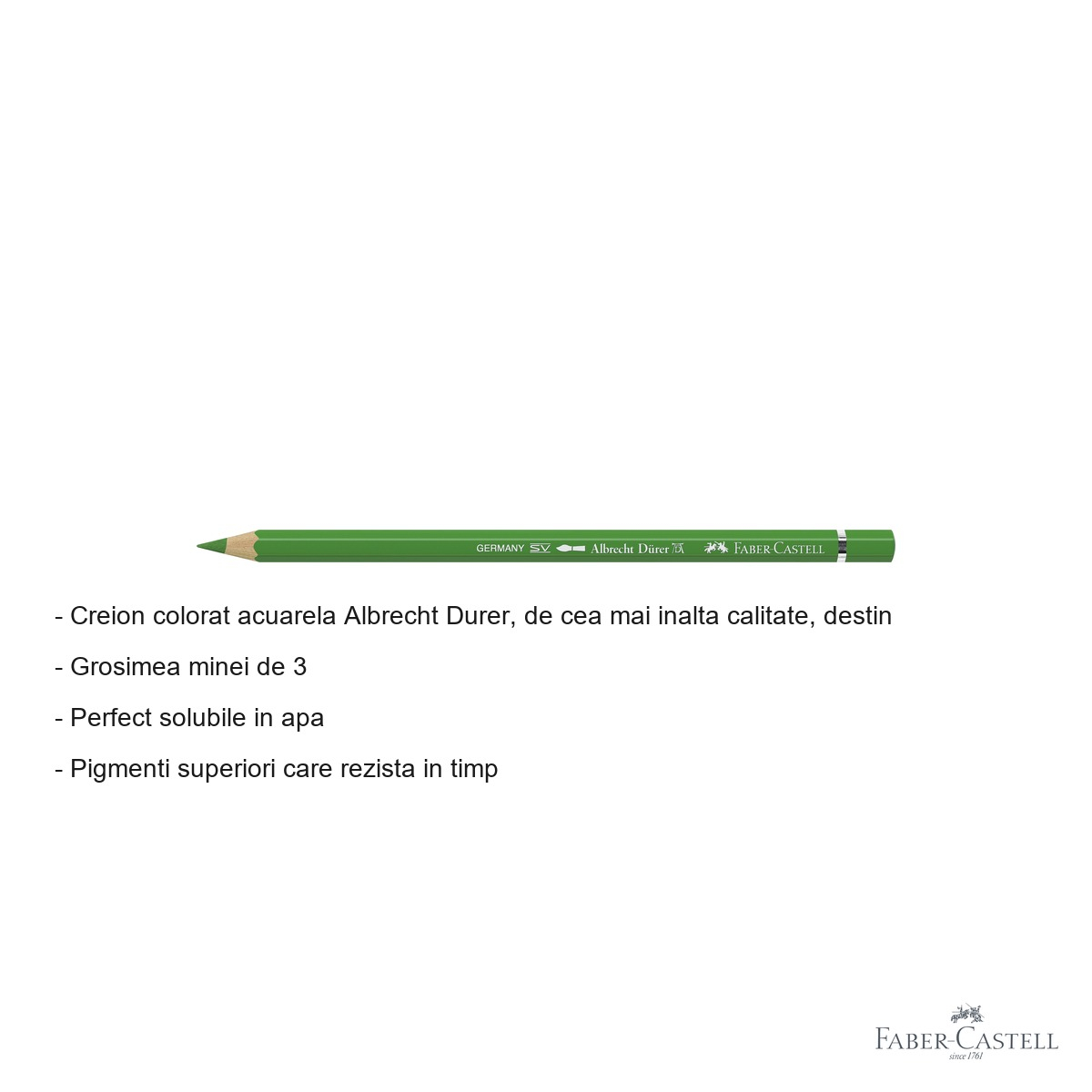 Creionul Albrecht Durer verde frunza 112 ofera control total asupra procesului creativ, permitand trecerea fluida de la desen detaliat la efecte de acuarela. Mina groasa de 3.8 mm asigura acoperire uniforma si permite lucrul pe suprafete mari fara efort. Rezistenta maxima la lumina garanteaza ca lucrarile isi vor pastra intensitatea cromatica timp de decenii, facandu-l ideal pentru lucrari destinate expunerii sau vanzarii.