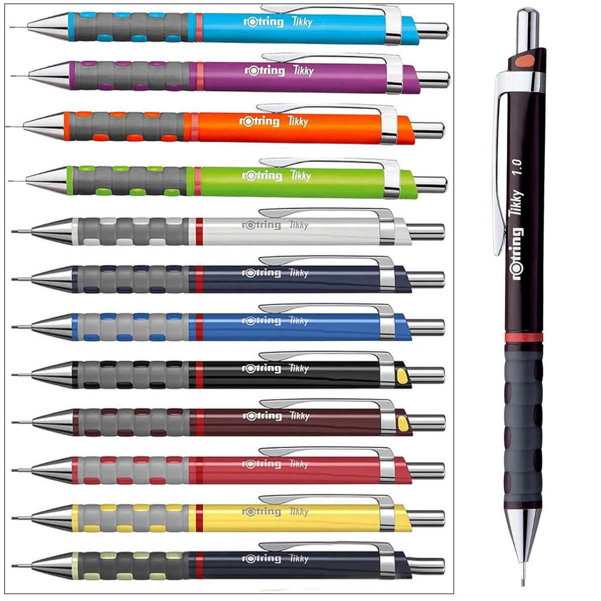 Alegand rotring Tikky 3, beneficiezi de garantia calitatii si durabilitatii brandului rotring, un grip din cauciuc care face o diferenta reala in confort, si versatilitatea data de compatibilitatea cu doua dimensiuni de mine, lucru neintalnit la majoritatea creioanelor din acelasi segment de pret.
