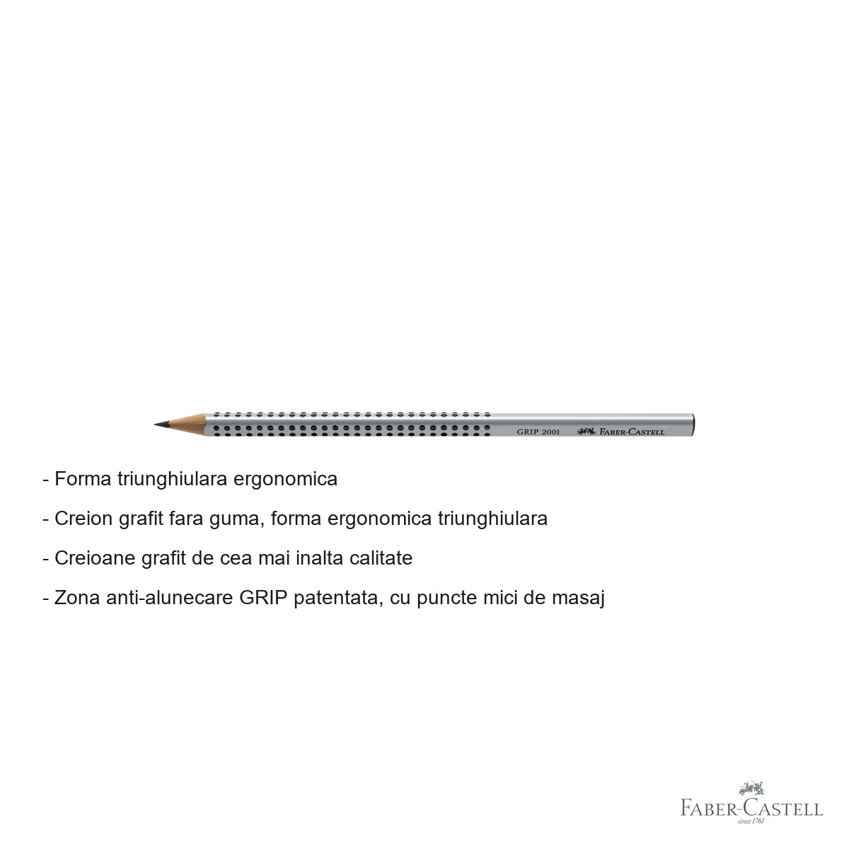 Unul dintre cele mai importante avantaje ale creionului Faber-Castell Grip 2001 este zona GRIP patentata cu puncte mici de masaj, care asigura o prindere sigura si confortabila chiar si in timpul sesiunilor lungi de scriere sau desen. Forma triunghiulara ergonomica ghideaza natural degetele in pozitia corecta, reducand oboseala mainii. Tehnologia speciala de lipire a minei (SV) face ca aceasta sa reziste la socuri si caderi accidentale, prevenind fragmentarea interioara a minei, un defect comun la creioanele de calitate slaba. Vopseaua pe baza de apa nu doar ca protejeaza mediul inconjurator, dar si asigura o finisare placuta la atingere. Lemnul moale de calitate garanteaza o ascutire uniforma, fara riscul de a se sparge sau fisura la ascutitoare.