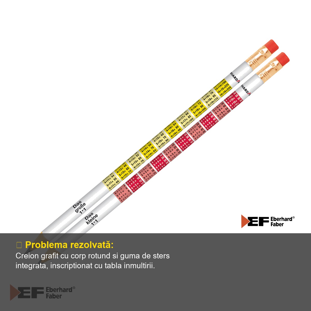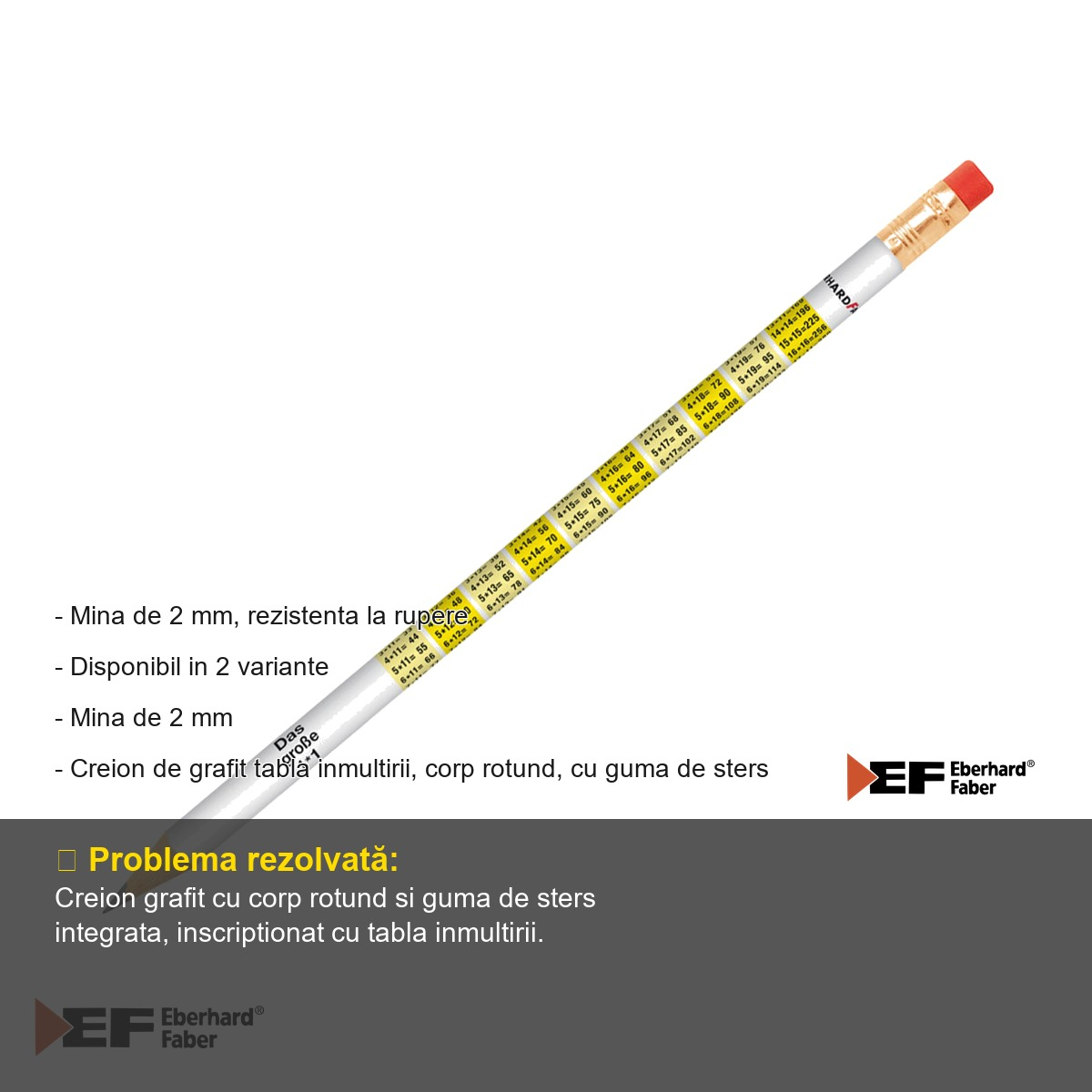 Fiecare scolar are nevoie de instrumente de scris de incredere, care sa il ajute atat la lectiile de scriere, cat si la cele de matematica. Creionul grafit Eberhard Faber cu tabla inmultirii este un produs ingenios, care combina utilitatea unui creion clasic de calitate cu un element educational valoros: tabla inmultirii printata direct pe corpul creionului. Astfel, copilul are mereu la indemana un mic ajutor in rezolvarea exercitiilor de matematica, fara sa fie nevoie de un caiet suplimentar sau de o fisa separata.