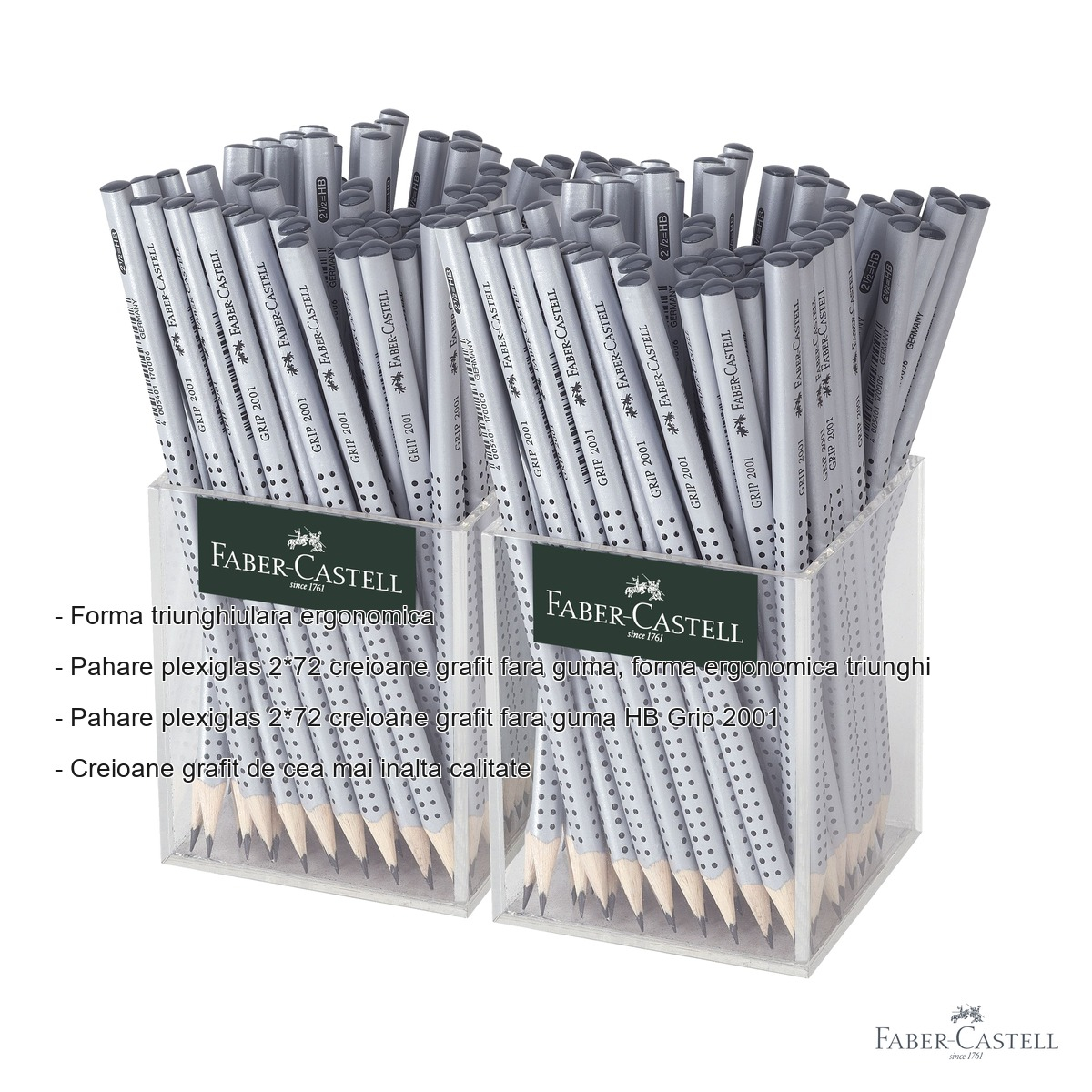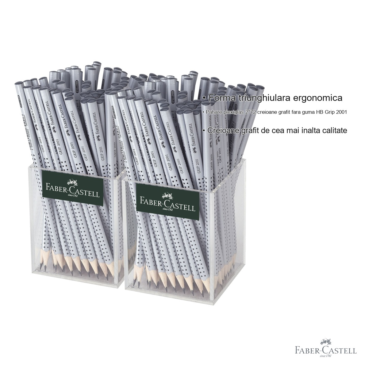 Set 144 creioane grafit fara guma Faber-Castell Grip 2001 HB, forma triunghiulara ergonomica, pentru scoala si birou