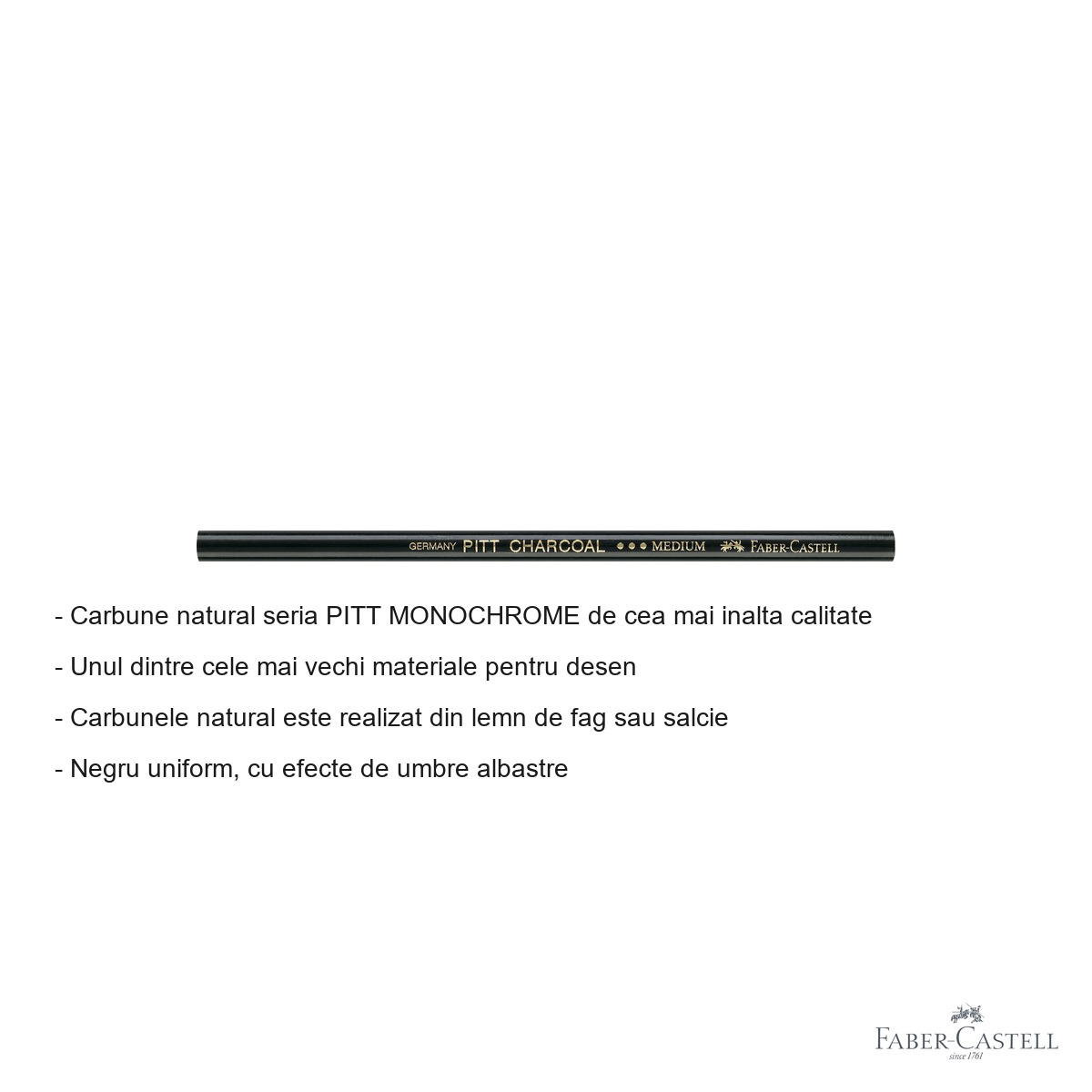 Creion carbune natural de cea mai inalta calitate din seria Pitt Monochrome Faber-Castell, grad de duritate mediu. Ofera un negru uniform cu efecte de umbre albastre, ideal pentru desen artistic. Poate fi sters si ascutit cu cutitul FC181398.