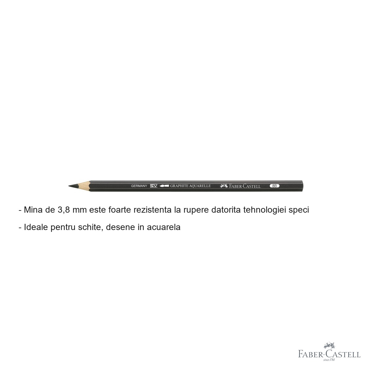 Solubilitatea deosebita a minei este caracteristica care transforma acest creion dintr-un simplu instrument de desen intr-un mediu artistic complex. Prin aplicarea apei cu o pensula pe zonele desenate, graful se dizolva uniform, creand gradiente si spalari similare acuarelei traditionale. Acest aspect permite artistilor sa exploreze tehnici mixte si sa obtina rezultate expresive folosind un singur tip de instrument. Calitatea superioara a gamei Graphite Aquarelle de la Faber-Castell garanteaza o solubilitate constanta si uniforma, indiferent de cantitatea de apa folosita.