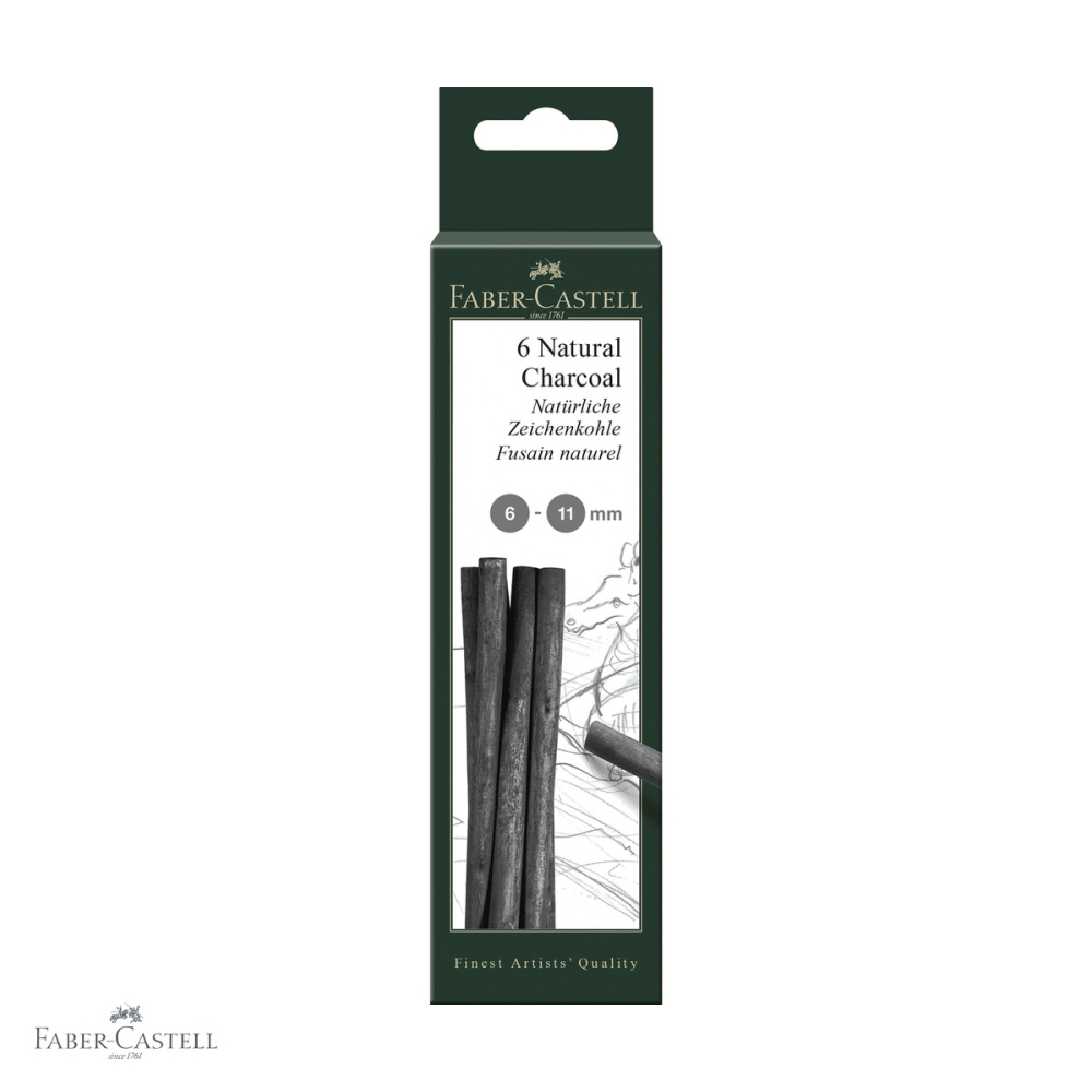 Carbune natural Pitt Monochrome Faber-Castell, 6 bucati/cutie, diametru 6-11mm. Negru uniform cu efecte de umbre albastre, ideal pentru desen artistic. Poate fi sters si corectat cu usurinta.