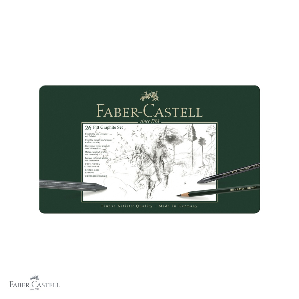 Set complet de grafit Faber-Castell cu 26 piese, incluzand creioane Castell 9000, Graphite Aquarelle, Pitt Pure si Pitt Graphite fara lemn. Ideal pentru artisti, ilustratori si pasionati de desen tehnic sau artistic. Gama larga de duritati pentru orice tehnica grafica.