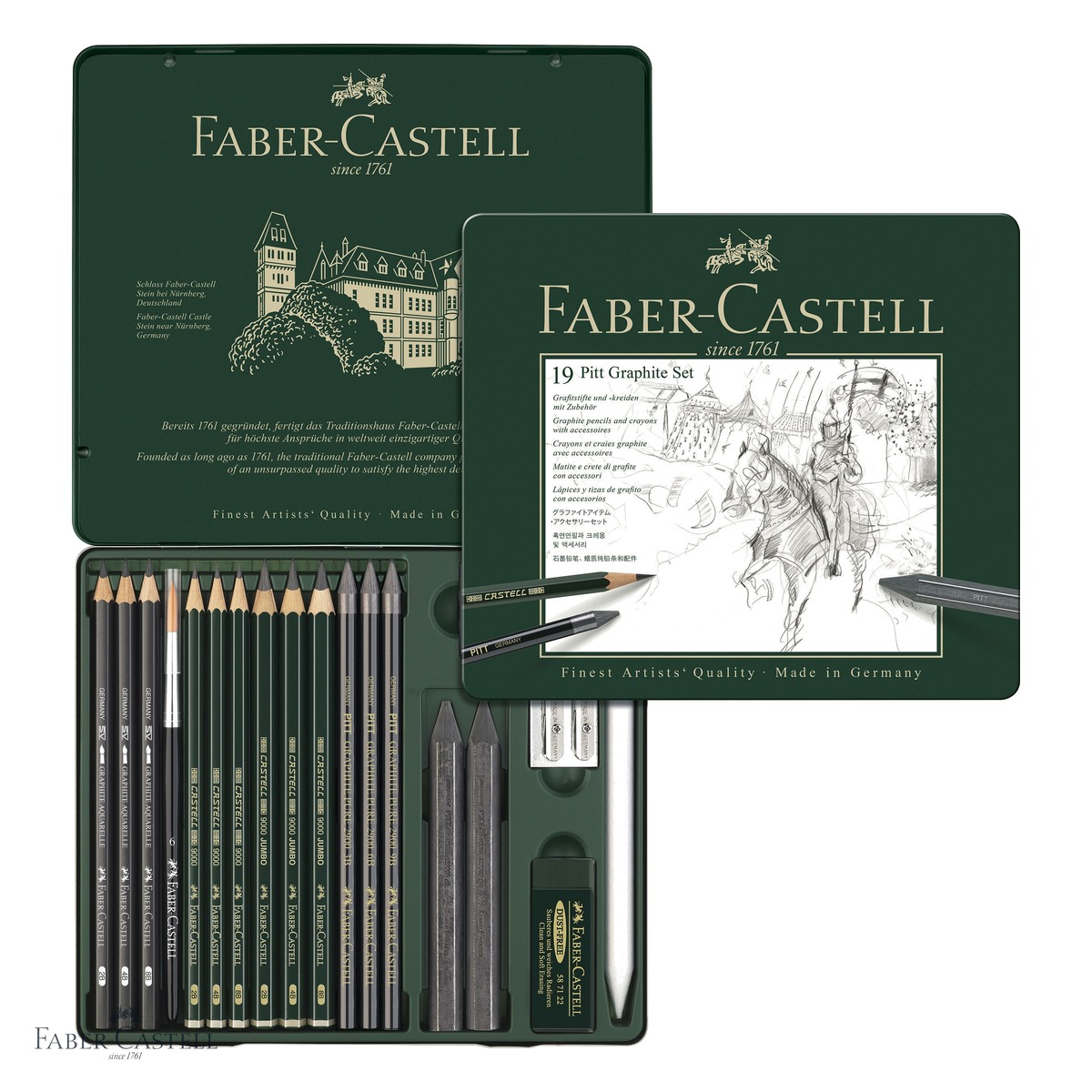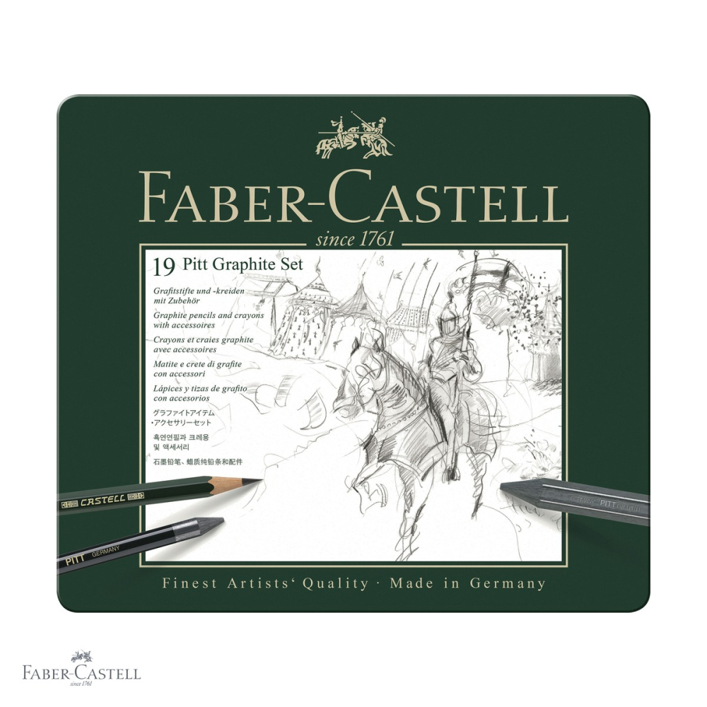 Orice artist, ilustrator sau pasionat de desen stie ca alegerea instrumentelor potrivite face diferenta dintre o schita mediocra si o opera de arta cu adevarat expresiva. Setul Pitt Monochrome Grafit de la Faber-Castell, cu 19 piese atent selectionate, ofera tot ce ai nevoie pentru a explora intreaga gama tonala a grafitului - de la griurile delicate si aeriene, pana la negrurile intense si profunde. Faber-Castell, un brand cu traditie de sute de ani in productia de instrumente de scris si desen, a creat aceasta colectie Pitt Grafit special pentru a raspunde nevoilor artistilor care lucreaza pe schite, portrete, peisaje sau orice tip de desen in tehnica grafitului. Setul este conceput pentru a oferi flexibilitate, precizie si versatilitate, reunind creioane din gamele consacrate Castell 9000, Castell 9000 Jumbo, Graphite Aquarelle si Pitt Graphite Pure, alaturi de accesorii utile.
