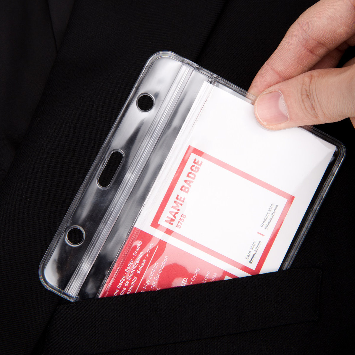 Cardul se introduce prin partea superioara a ecusonului, care este deschisa. Dupa introducere, marginile se aliniaza si se inchid ermetic prin apasarea si alunecarea sistemului zip plastic de-a lungul intregii latimi.