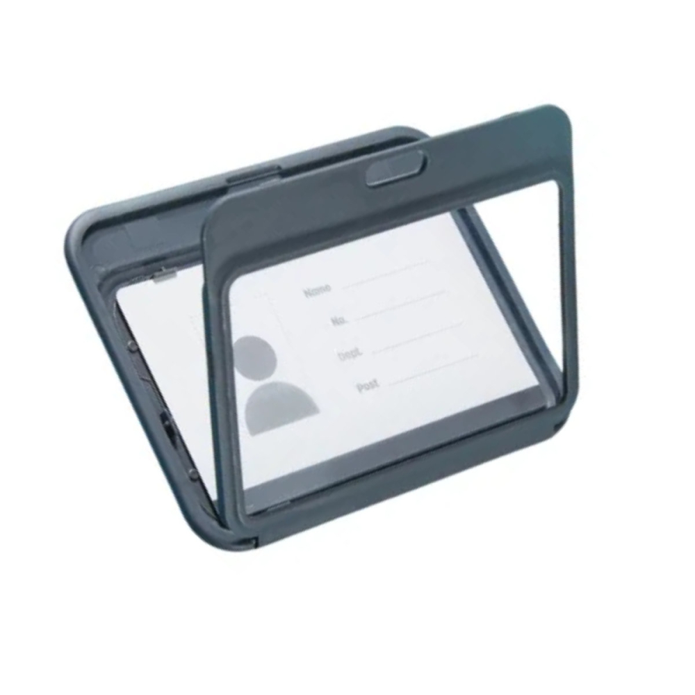 Ecusonul are un spate rabatabil. Deschideti aceasta parte, introduceti cardurile in cele doua receptacule transparente si inchideti spatele pana se fixeaza.