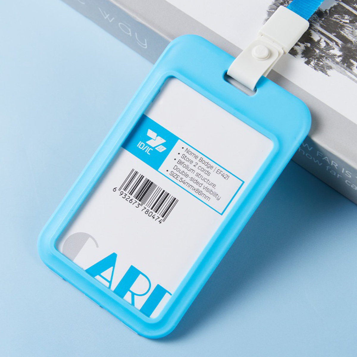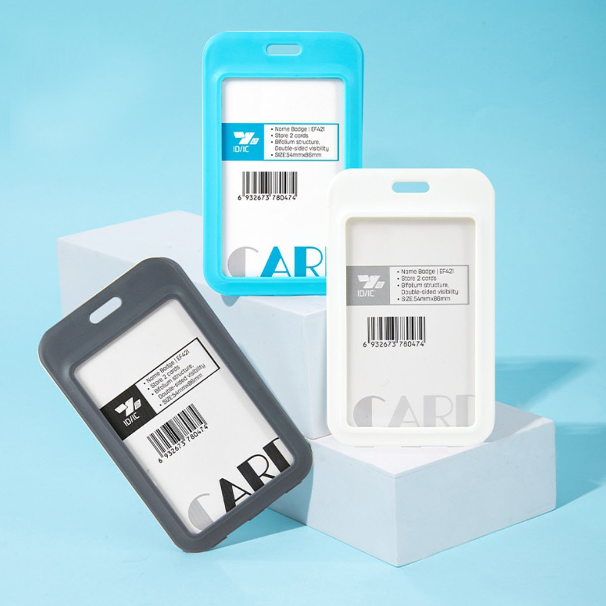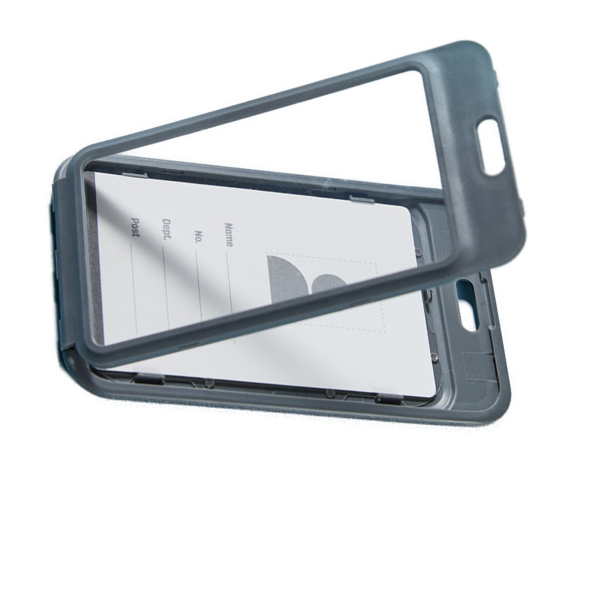 • Vizibilitate completa pe ambele parti: Designul cu doua fete asigura ca informatiile de pe ambele carduri sunt afisate clar, fara a fi necesara intoarcerea badge-ului.