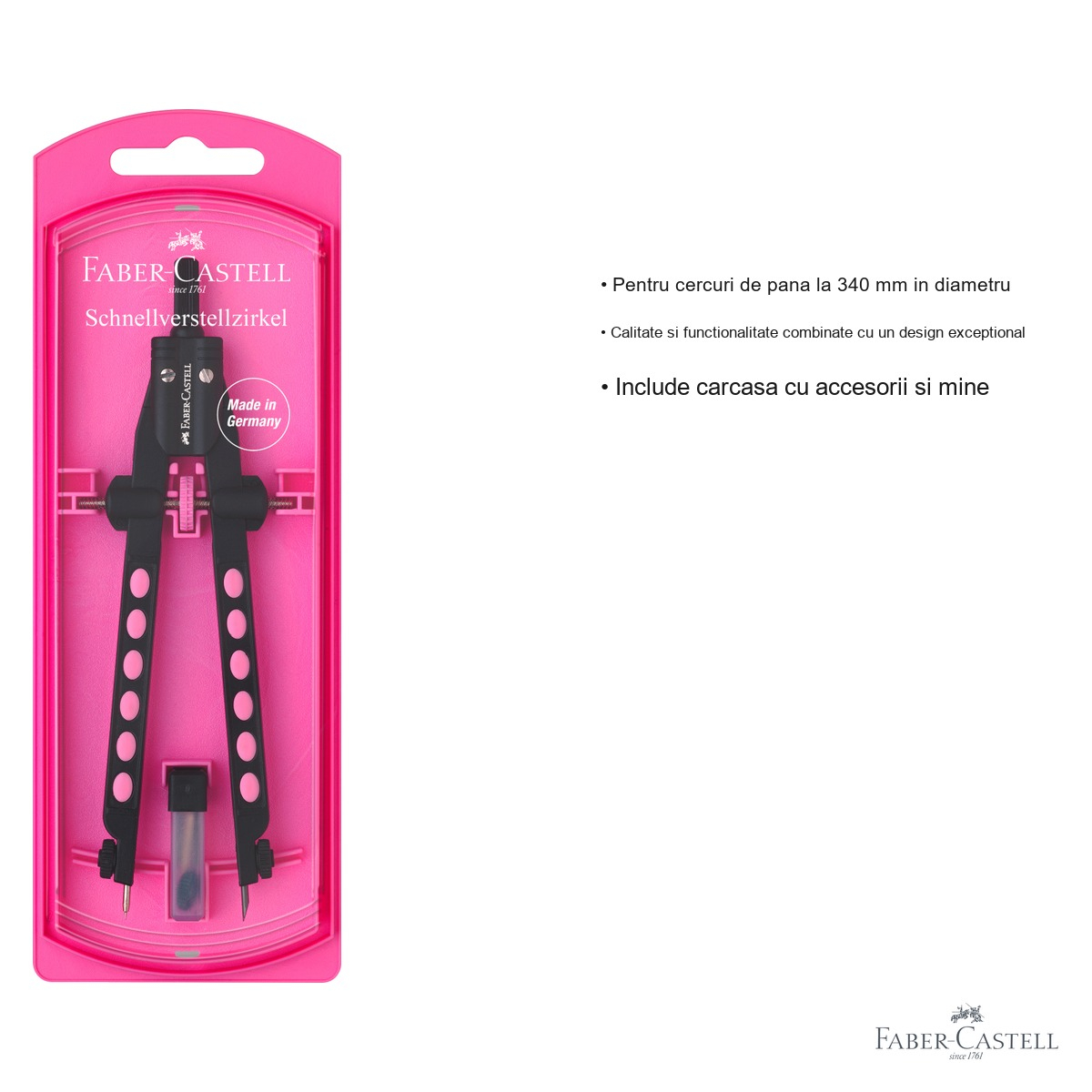 Calitatea Faber-Castell, recunoscuta la nivel mondial, garanteaza ca acest compas va rezista in timp, chiar si in conditii de utilizare intensa specifica mediului scolar. Materialele robuste asigura stabilitatea bratelor si a varfului in timp ce desenezi, prevenind alunecarea sau deformarea cercului. In plus, setul include carcasa de protectie, accesorii si mine, astfel ca produsul este complet gata de utilizare imediat dupa achizitie.