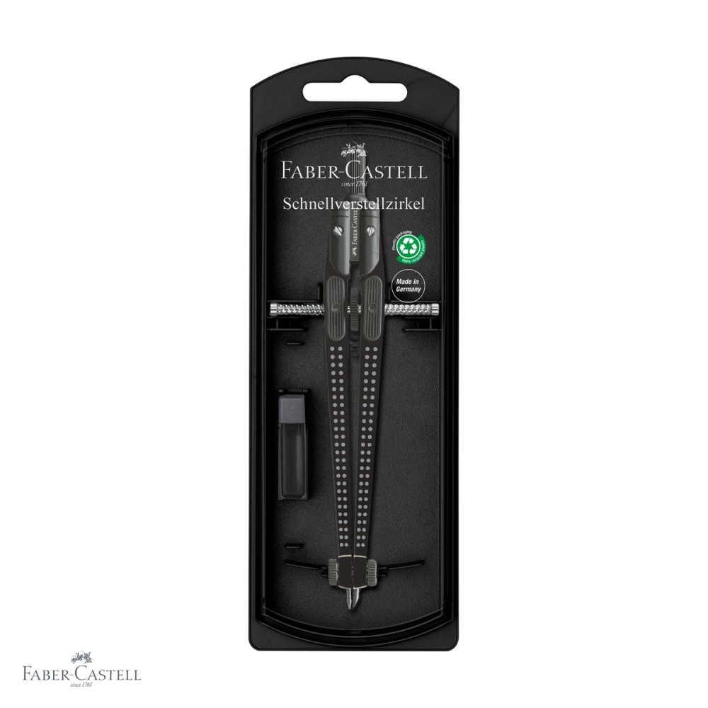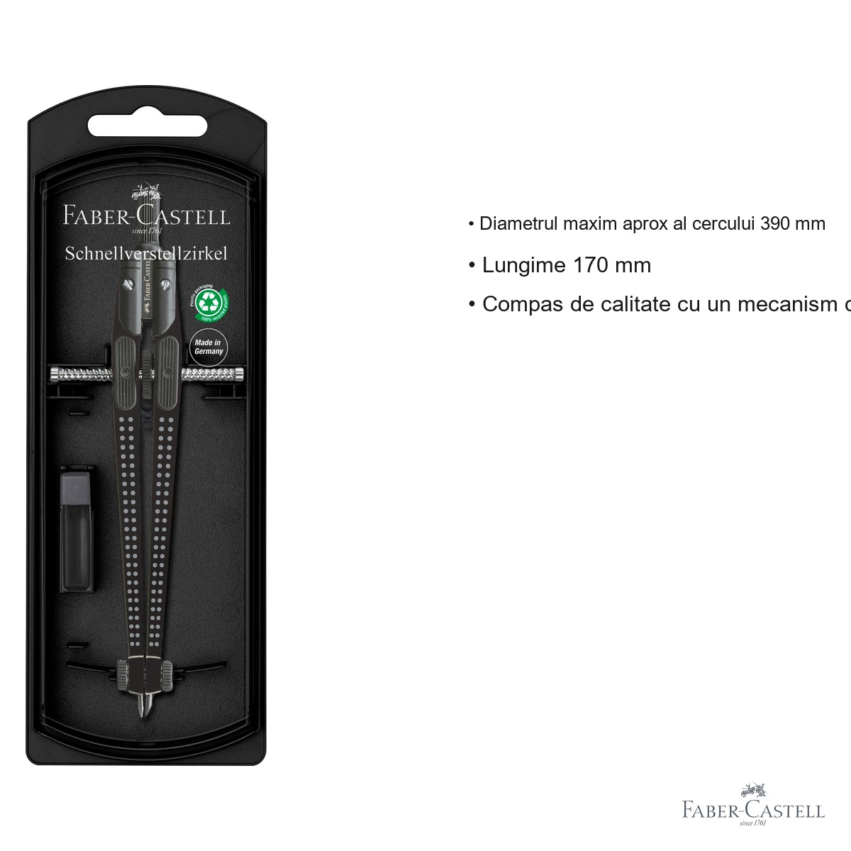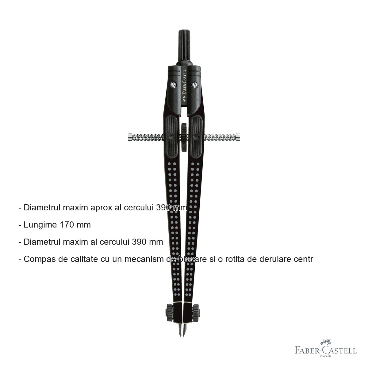 Compasul Faber-Castell Quick-Set Grip ofera mai multe avantaje fata de modelele clasice. In primul rand, mecanismul de blocare asigura fixarea bratelor la unghiul dorit, prevenind modificarea accidentala a razei in timp ce desenezi. Acest lucru este esential atunci cand trebuie sa reproduci acelasi cerc de mai multe ori sau cand lucrezi pe suprafete mari. In al doilea rand, rotita de derulare centrala permite ajustarea precisa si lina a distantei dintre brate, eliminand miscarile bruste care pot strica un desen. In al treilea rand, proeminentele Grip 2001 asigura o prindere ergonomica, reducand oboseala mainii in timpul sesiunilor lungi de lucru. Faber-Castell este un brand recunoscut la nivel international pentru calitatea materialelor si durabilitatea produselor sale, ceea ce garanteaza ca acest compas va rezista in timp chiar si la utilizare intensa.