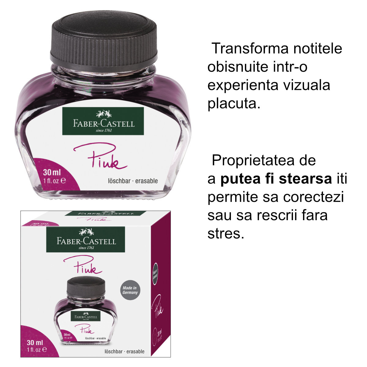 Daca iti doresti sa iesi din rutina culorilor traditionale si sa iti infrumusetezi scrisul cu o nuanta moderna si plina de viata, alegerea este evidenta: Cerneala roz care poate fi stearsa Faber-Castell. Ea combina distractia culorii cu practicitatea corectarii usoare, toate intr-un ambalaj robust si elegant. Comanda-ti sticla astazi si descopera cat de distractiv poate sa fie sa scrii!