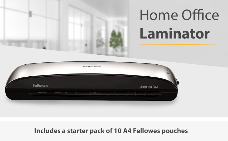 Laminatorul Fellowes Spectra A3 si un kit de laminare cu 10 folii (probabil format A3, 80-125 microni).