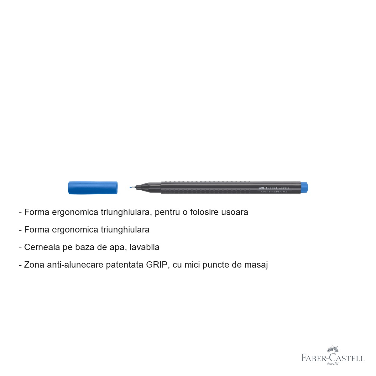 Liner-ul Faber-Castell Grip 0.4 mm se remarca prin combinatia dintre ergonomie si performanta tehnica. Forma triunghiulara a corpului este conceputa pentru a reduce oboseala mainii in sesiunile lungi de scriere sau desen, asigurand o pozitie corecta si stabila a degetelor. Zona Grip patentata, cu micile sale puncte de masaj, previne alunecarea instrumentului din mana, chiar si atunci cand lucrezi rapid sau sub presiune. Cerneala pe baza de apa si substante naturale este o alegere responsabila atat pentru utilizator, cat si pentru mediu, iar proprietatile lavabile reprezinta un avantaj enorm in spatiile de lucru active sau in mediul educational. Culoarea albastra este luminoasa si expresiva, oferind contrast excelent pe hartia alba sau crem. Varul de 0.4 mm este suficient de fin pentru a permite utilizarea cu rigla si sabloane fara a deteriora marginile acestora, garantand linii drepte si uniforme.