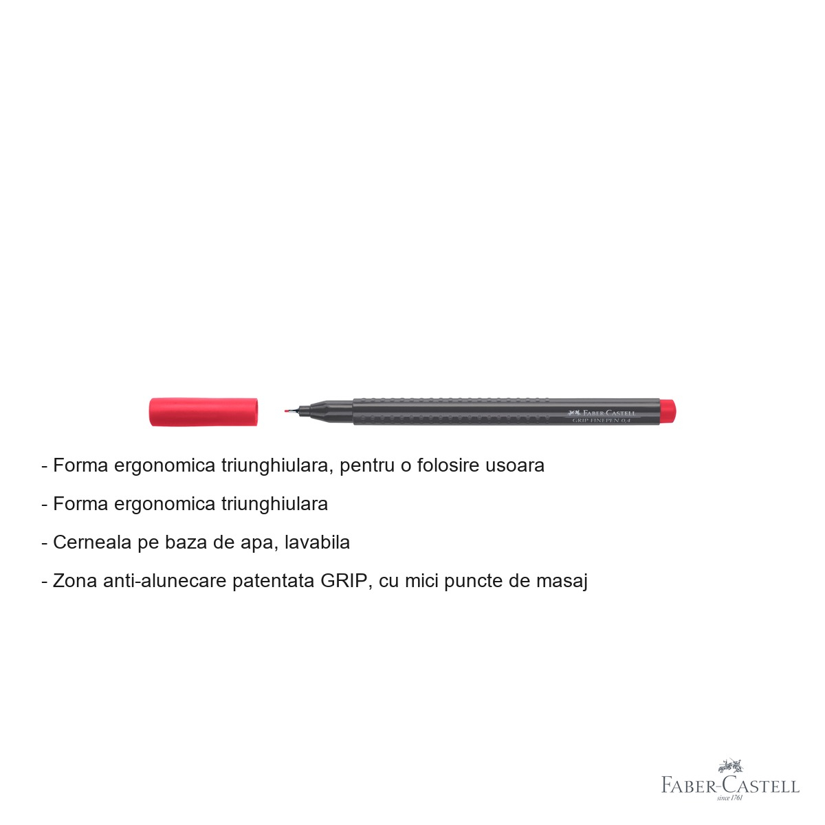 Linerul Faber-Castell 0.4 mm rosu magenta reuneste intr-un singur instrument mai multe avantaje care il fac superior fata de linere obisnuite. Forma triunghiulara ergonomica previne oboseala mainii chiar si dupa utilizare indelungata, ideal pentru sesiuni lungi de lucru sau studiu. Zona GRIP patentata, cu micile sale puncte de masaj, ofera o priza sigura si confortabila, eliminand riscul de alunecare chiar si in conditii de utilizare intensa.