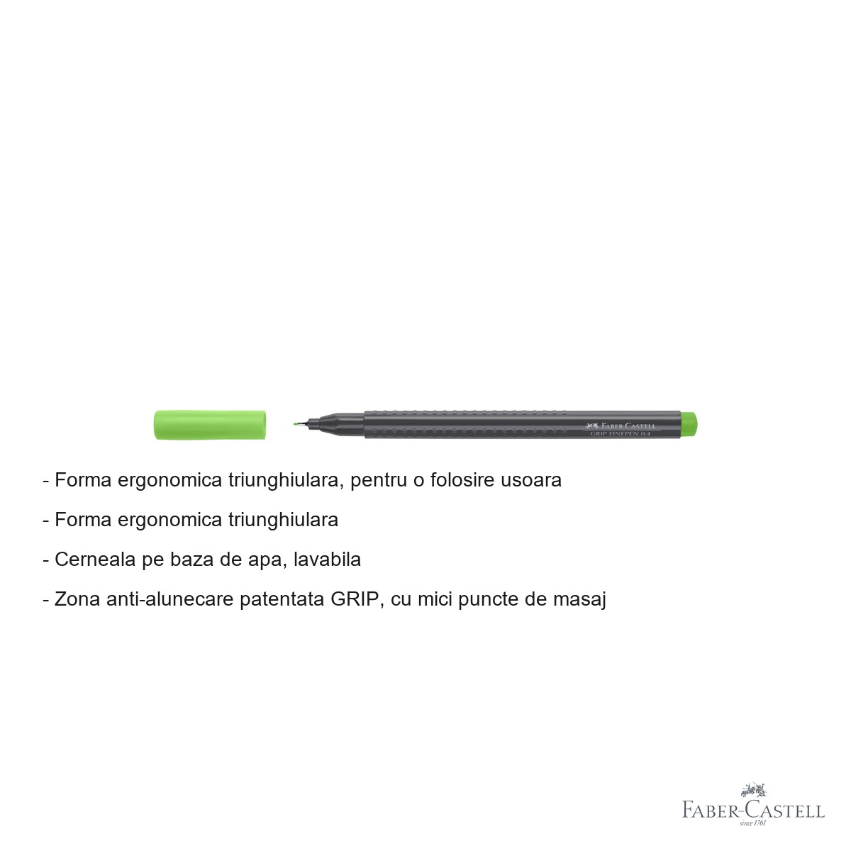 Linerul Faber-Castell Grip 0.4 mm verde iarba ofera o serie de avantaje clare fata de instrumentele obisnuite de scris. In primul rand, forma triunghiulara ergonomica asigura o pozitie corecta si stabila a degetelor, reducand oboseala la utilizare indelungata - un aspect important mai ales pentru cei care scriu sau deseneaza perioade lungi de timp. Zona Grip patentata, cu micile sale puncte de masaj, previne alunecarea instrumentului din mana, oferind un control sporit al liniei.