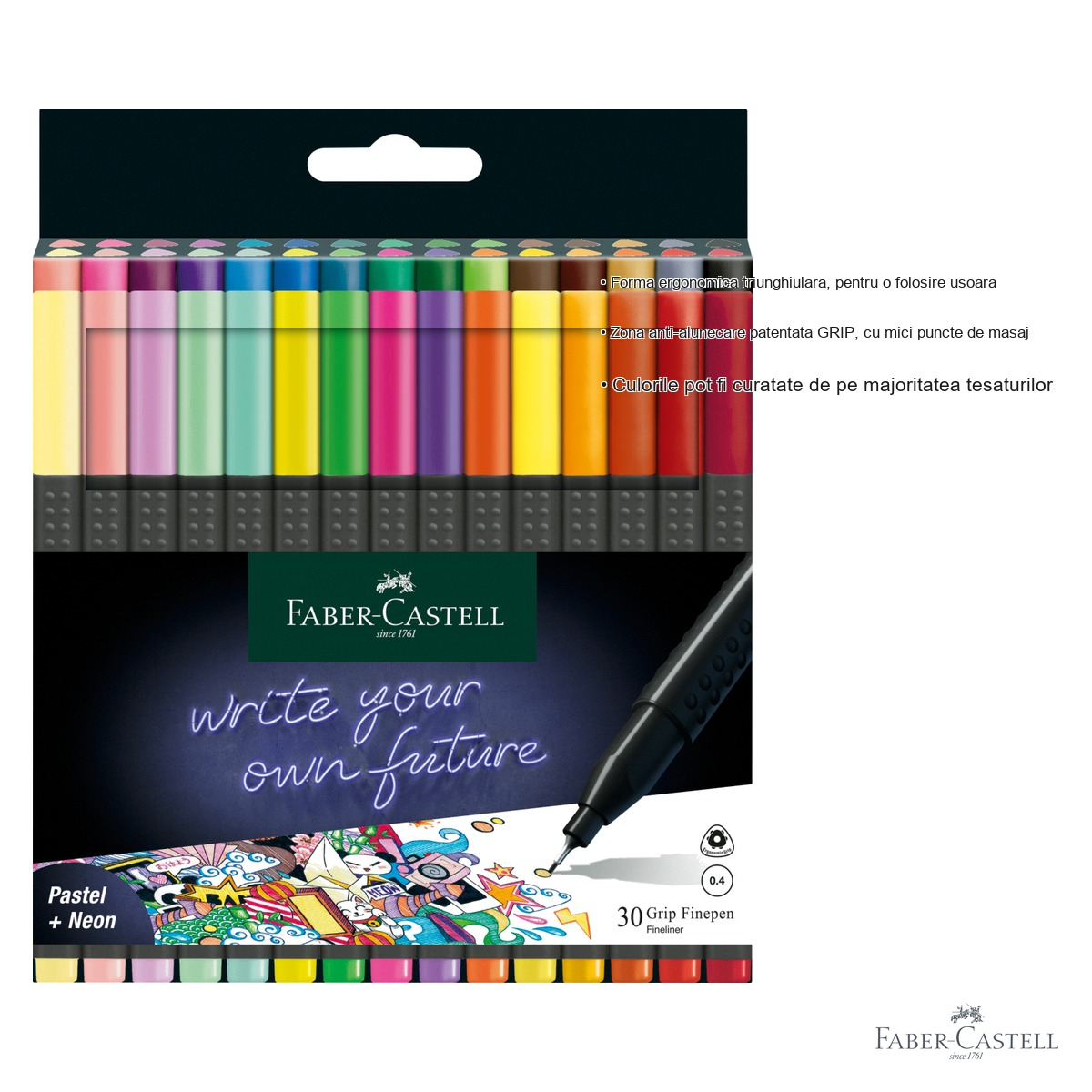 Linerul Faber-Castell Grip 0.4mm se remarca prin mai multe avantaje care il fac sa fie preferat de utilizatori din toate categoriile. In primul rand, zona anti-alunecare GRIP patentata, cu micile sale puncte de masaj, reduce oboseala mainii si ofera un control sporit in timpul scrierii sau desenului indelungat. Forma triunghiulara ergonomica a corpului instrumentului asigura o prindere naturala si confortabila, reducand tensiunea musculara chiar si in sesiunile lungi de lucru. Versatilitatea setului este data de cele 30 de culori incluse: culori standard pentru uz general, culori pastel pentru efecte delicate si culori neon pentru accente vibrate si atragatoare. Culorile luminoase si expresive fac ca lucrarile realizate sa aiba un impact vizual puternic. Un alt beneficiu important este faptul ca aceste linere sunt potrivite atat pentru dreptaci, cat si pentru stangaci, ceea ce le face accesibile tuturor utilizatorilor. In plus, ambalajul reciclabil al setului reflecta angajamentul brandului Faber-Castell fata de sustenabilitate si responsabilitate fata de mediu.