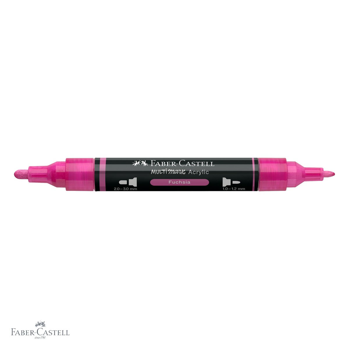 Marker acrilic Faber-Castell Multimark, culoare fucsia 125, cu cerneala pe baza de apa, opaca si varf dublu (2-3 mm si 1-1,2 mm). Ideal pentru aplicare pe hartie, carton, lemn, panza, sticla, metal, piatra si plastic. Indicator nivel cerneala inclus.