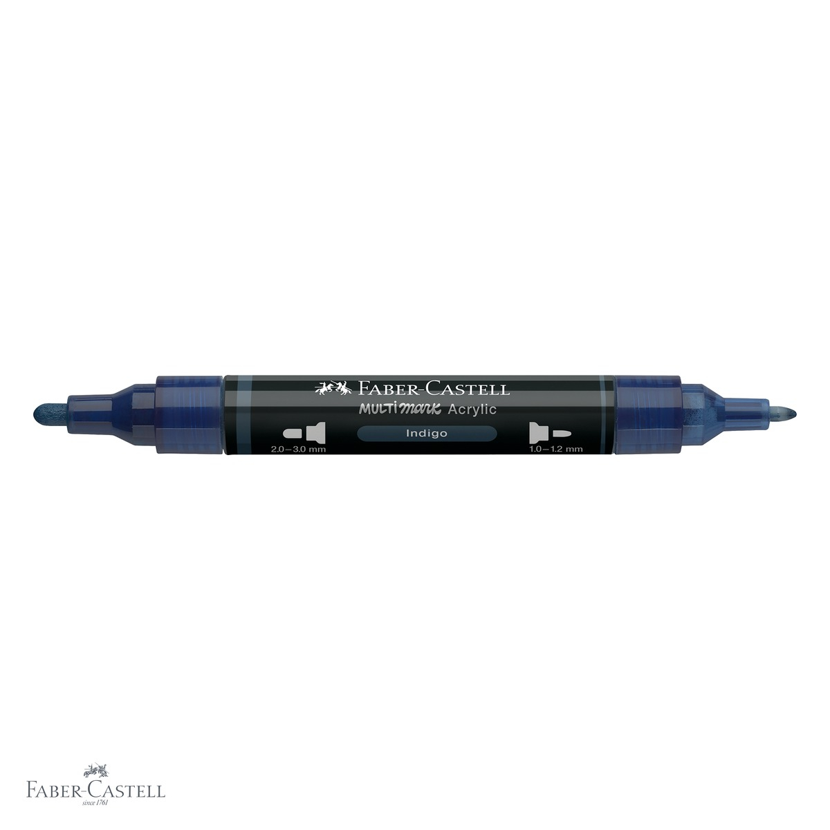 Marker acrilic Faber-Castell Multimark cu cerneala pe baza de apa, opaca, in nuanta indigo 450. Varf dublu (2-3mm si 1-1,2mm) pentru acoperire larga si detalii fine. Compatibil cu hartie, lemn, sticla, metal, panza si plastic.