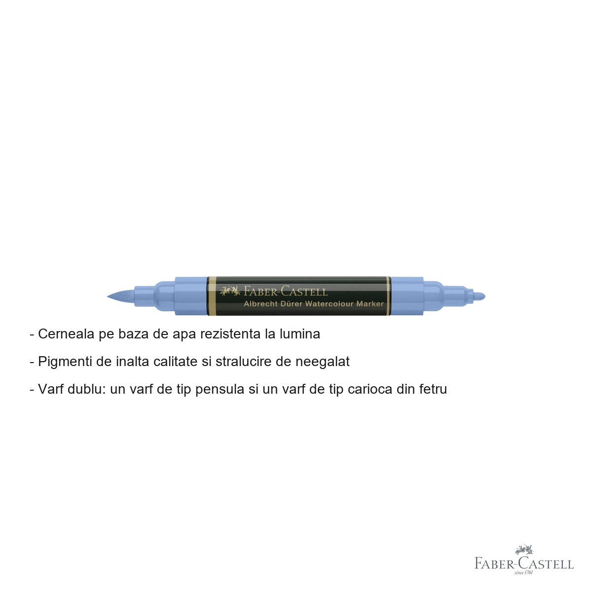 Marker acuarela Faber-Castell Albrecht Durer cu varf dublu - pensula si carioca din fetru. Cerneala pe baza de apa, rezistenta la lumina, pigmenti de inalta calitate. Ideal pentru schite rapide si pictura in acuarela.