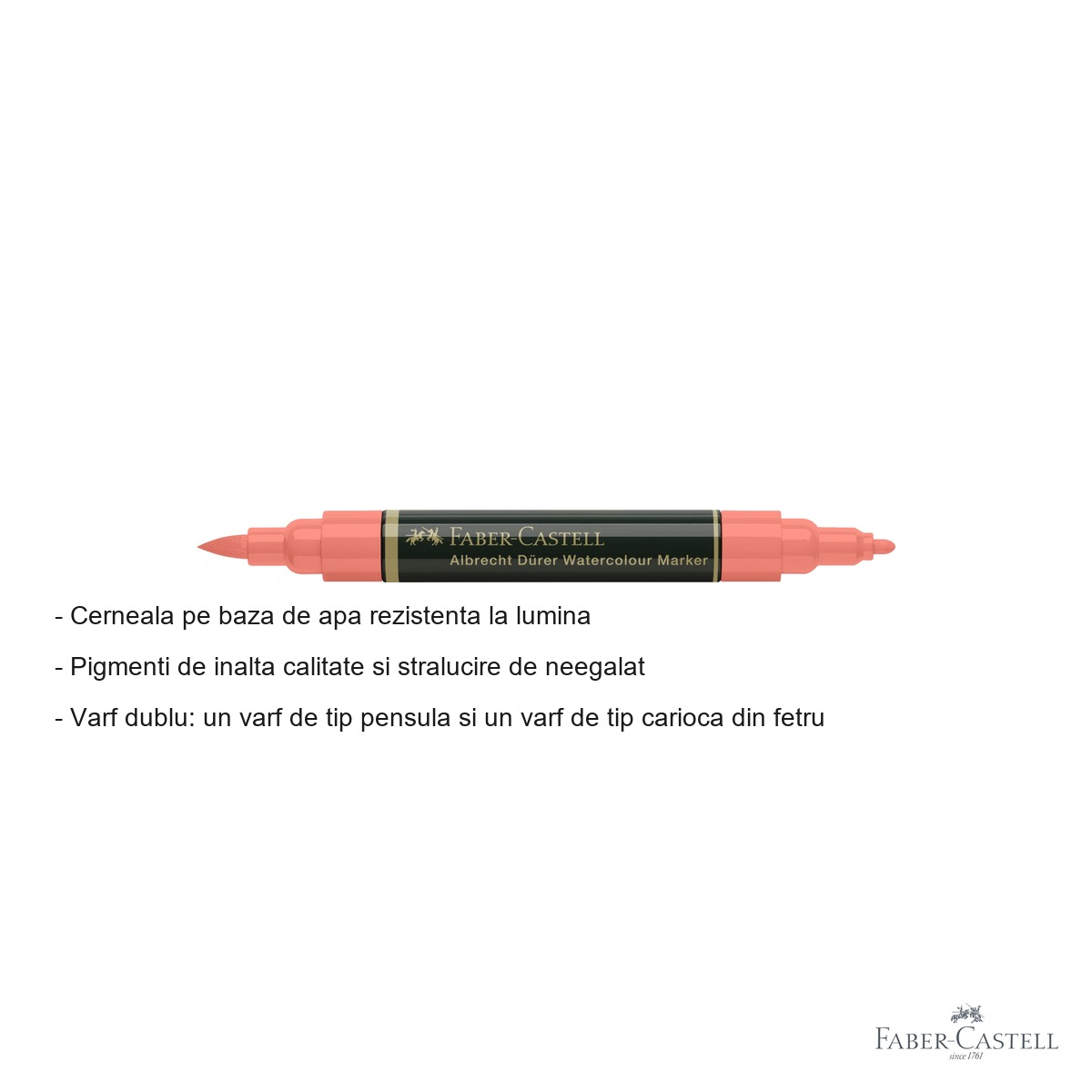 Marker acuarela Faber-Castell Albrecht Durer cu cerneala rezistenta la lumina, pigmenti de inalta calitate. Varf dublu: pensula flexibila si carioca fetru 1-2 mm. Ideal pentru schite, ilustratie si pictura acuarela.