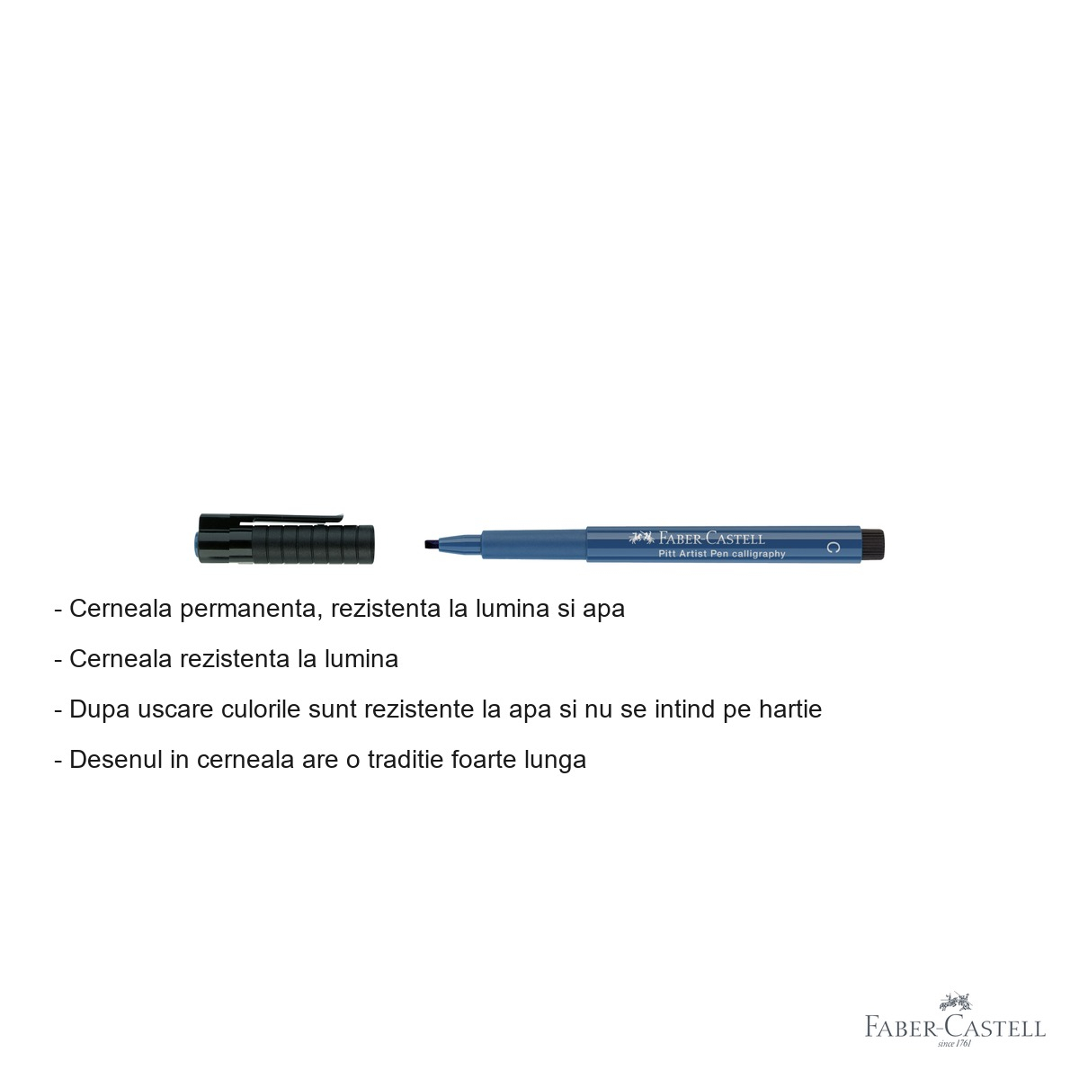 Orice artist, designer sau pasionat de desen stie ca instrumentul potrivit face diferenta dintre o lucrare mediocra si una remarcabila. Markerul caligrafic Faber-Castell Pitt Artist Pen cu varf de tip pensula si cerneala albastra indiana iti ofera exact combinatia de care ai nevoie: flexibilitate, control si durabilitate. Fie ca lucrezi la schite rapide, ilustratii detaliate, design de moda sau caligrafie creativa, acest marker iti pune la dispozitie un instrument testat si validat de artisti profesionisti din intreaga lume. Traditia cernelii ca mediu artistic intalneste tehnologia moderna a markerului Pitt - rezultatul este un instrument versatil, usor de utilizat si cu rezultate de exceptie.