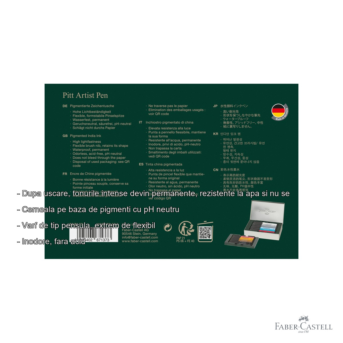 Markerele Pitt Artist Pen de la Faber-Castell sunt recunoscute la nivel mondial pentru calitatea lor exceptionala. Cerneala cu pH neutru protejeaza lucrarile in timp, prevenind ingalbenirea sau deteriorarea hartiei. Dupa uscare, culorile raman stabile, intense si rezistente la apa, ceea ce inseamna ca poti aplica straturi suplimentare de acuarela sau alte medii umede fara riscul de a deteriora desenul. Varful de tip pensula ofera o flexibilitate remarcabila, permitand atat trasaturi subtiri si precise, cat si zone largi de culoare, totul cu acelasi marker. Faptul ca markerele sunt inodore si fara acid le face sigure pentru utilizare prelungita, inclusiv in spatii inchise sau de catre persoane sensibile la mirosuri chimice. In plus, ambalajul elegant al editiei Cities London le transforma intr-un cadou ideal pentru orice artist sau pasionat de arta.