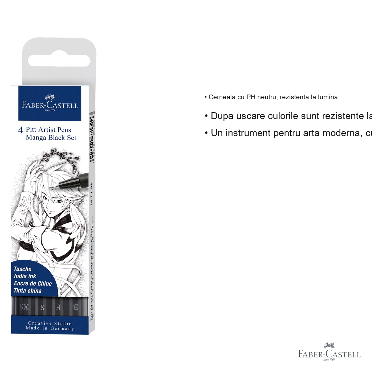 Set 4 linere Pitt Artist Pen Manga Faber-Castell in negru, cu varfuri XS (0.1mm), S (0.3mm), F (0.5mm) si pensula. Cerneala pigmentata, rezistenta la apa si lumina, ideala pentru manga si ilustratie.