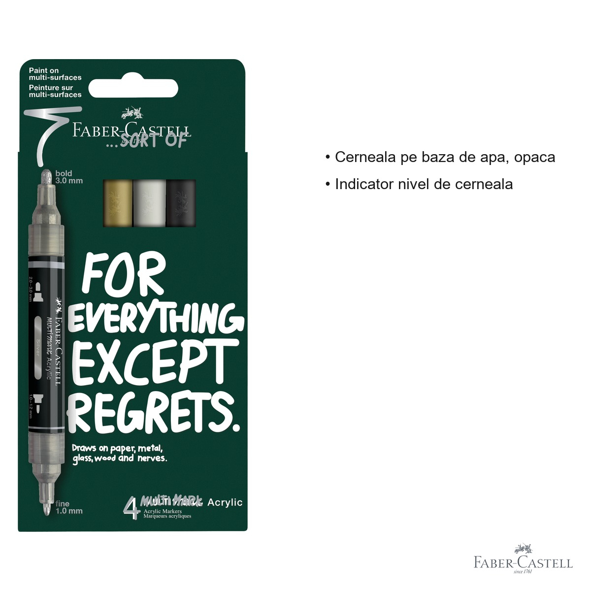 Setul de markere acrilice Faber-Castell Multimark aduce cu sine o serie de avantaje clare fata de markerele obisnuite. In primul rand, cerneala acrilica pe baza de apa este opaca, ceea ce inseamna ca culorile acopera complet suprafata, inclusiv pe fonduri inchise. Culoarea alba si cea aurie sunt vizibile chiar si pe suprafete negre sau inchise la culoare, ceea ce le face ideale pentru efecte decorative deosebite. Varful dublu este un mare avantaj practic: poti trece rapid de la zone largi de acoperire la detalii fine si precise, fara a mai schimba instrumentul. Indicatorul de nivel al cernelii este o functie utila care te ajuta sa stii din timp cand trebuie sa inlocuiesti markerul, evitand intreruperile neplacute in mijlocul unui proiect. Faber-Castell este un brand cu traditie indelungata in productia de instrumente de scriere si desen, garantand o calitate constanta si fiabila a produselor sale.