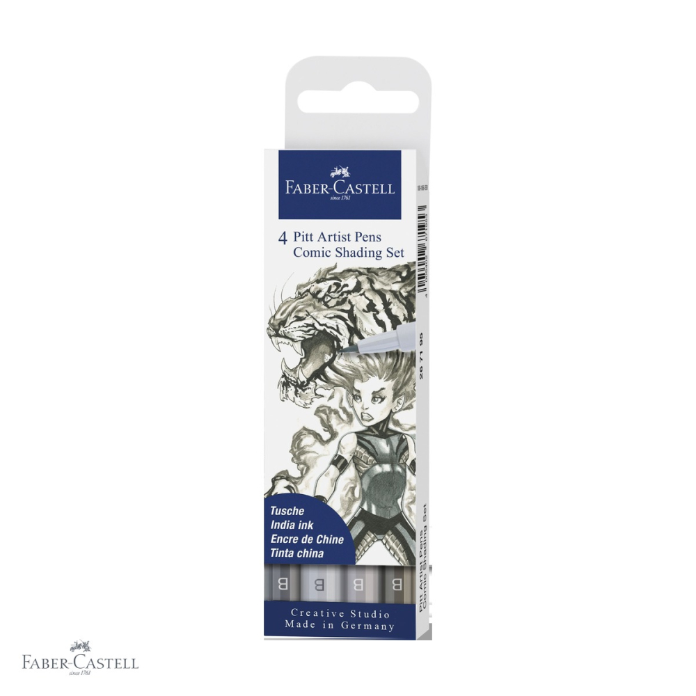 Setul Pitt Artist Pen Comic Gri este rezultatul colaborarii Faber-Castell cu ilustratori profesionisti de benzi desenate, ceea ce inseamna ca fiecare detaliu a fost gandit pentru a raspunde nevoilor reale ale artistilor. Varful tip pensula ofera o flexibilitate remarcabila - poti crea atat linii fine si precise, cat si trasaturi late, pline, in functie de presiunea aplicata. Cele 4 nuante de gri din set - doua tonuri de gri rece (I si IV) si doua tonuri de gri cald (III si IV) - acopera un spectru larg de valori tonale, permitand artistului sa construiasca umbre, semitonuri si lumini cu naturalete. Combinatia dintre griurile reci si cele calde adauga o dimensiune cromatica subtila lucrarilor, conferind profunzime si realisme vizuale. Cerneala este durabila, rezistenta la lumina si compatibila cu alte tehnici de desen, astfel incat lucrarile isi pastreaza aspectul in timp.