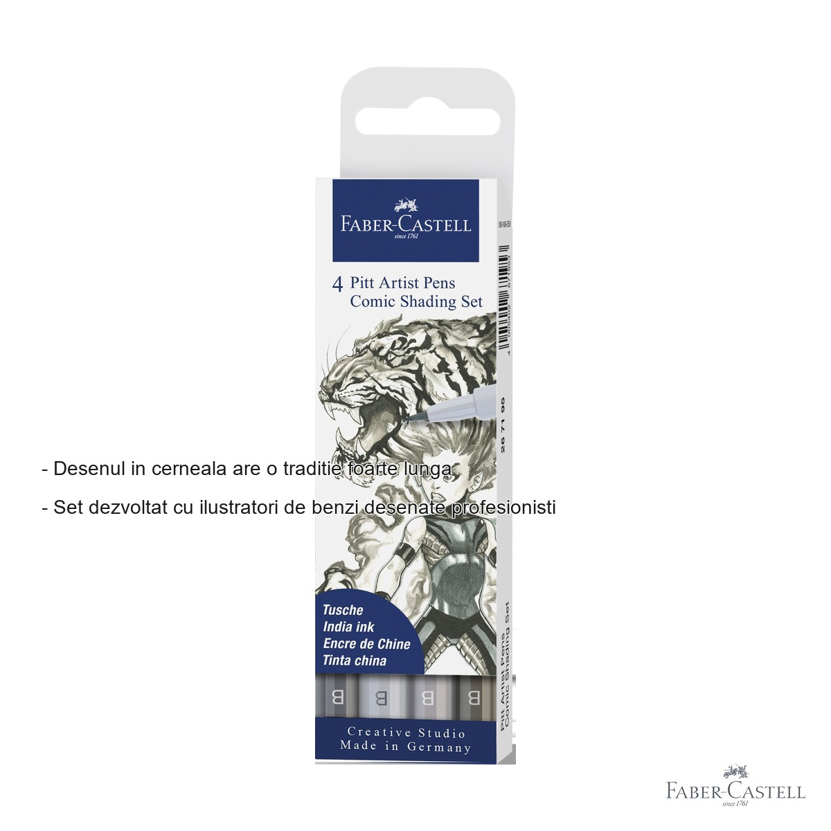 Desenul in cerneala are o traditie foarte lunga si a reprezentat intotdeauna un mediu preferat de artisti si graficieni din intreaga lume. Cerneala ofera expresivitate, durabilitate si versatilitate, putand fi combinata cu alte tehnici de desen pentru rezultate vizuale deosebite. Daca esti ilustrator, creator de benzi desenate sau pur si simplu pasionat de arta grafica, setul Pitt Artist Pen Comic Gri de la Faber-Castell iti pune la dispozitie instrumentele perfecte pentru a crea umbre, gradiente si efecte de profunzime cu usurinta si precizie. Faber-Castell a reusit sa imbine avantajele cernelii traditionale cu comoditatea unui instrument modern, rezultand markerul cu pensula Pitt - un instrument versatil, controlabil si de inalta calitate.