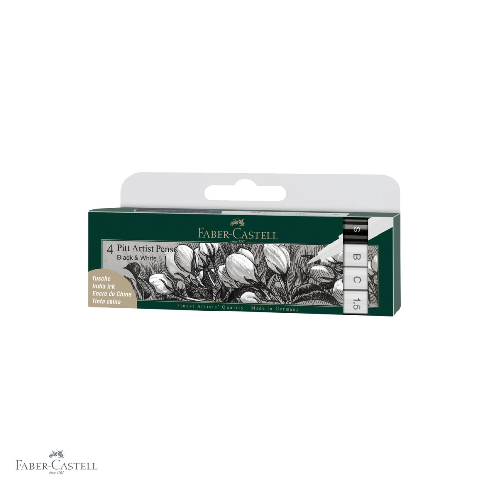 Set 4 markere Pitt Artist Pen Faber-Castell, varf pensula si caligrafic, alb si negru, pentru ilustratie si design