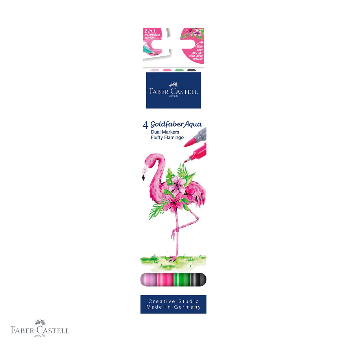 Set 4 markere solubile pe baza de apa Faber-Castell Goldfaber, colectia Tropical, cu varf flexibil pentru pictura si fineliner 0.6 mm pentru detalii. Fara miros, fara acid, corp si capac din material 100% reciclat.