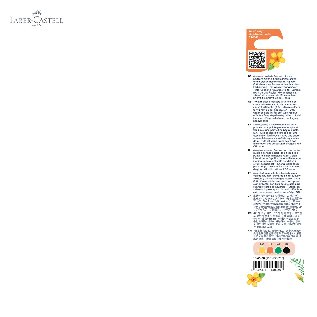 Daca esti pasionat de desen, ilustratie sau pictura artistica si cauți un instrument versatil, precis si eco-friendly, setul de 4 markere solubile Goldfaber Faber-Castell din colectia Tropical Toucan este alegerea perfecta. Fie ca esti la inceput de drum sau un artist cu experienta, aceste markere cu doua capete iti ofera controlul complet asupra liniei si culorii. Varful flexibil imita comportamentul unei pensule reale, in timp ce varful fineliner metalic asigura contururi clare si detalii fine. Solubile in apa, culorile pot fi estompate si amestecate cu usurinta, deschizand posibilitati creative nelimitate.