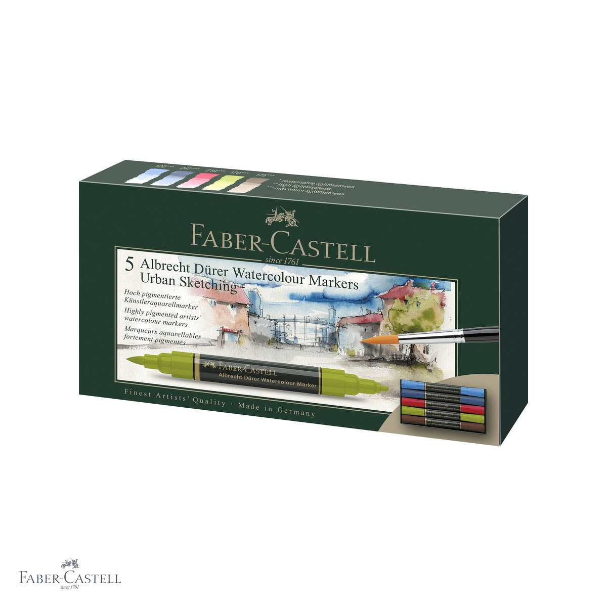 Daca esti artist, ilustrator, designer sau pasionat de tehnicile de acuarela, setul de 5 markere solubile Faber-Castell A.Durer reprezinta o alegere de exceptie. Aceste instrumente redefinesc pictura moderna in acuarela, oferind versatilitate, precizie si culori vibrante intr-un singur instrument elegant. Fie ca lucrezi la schite rapide in aer liber, fie ca realizezi ilustratii complexe in atelier, markerele A.Durer iti pun la dispozitie tot ce ai nevoie: un varf de pensula flexibil si un varf de carioca fin, ambele in acelasi instrument. Nu mai este nevoie sa schimbi constant instrumentele - totul este la indemana ta, intr-un set compact si usor de transportat.
