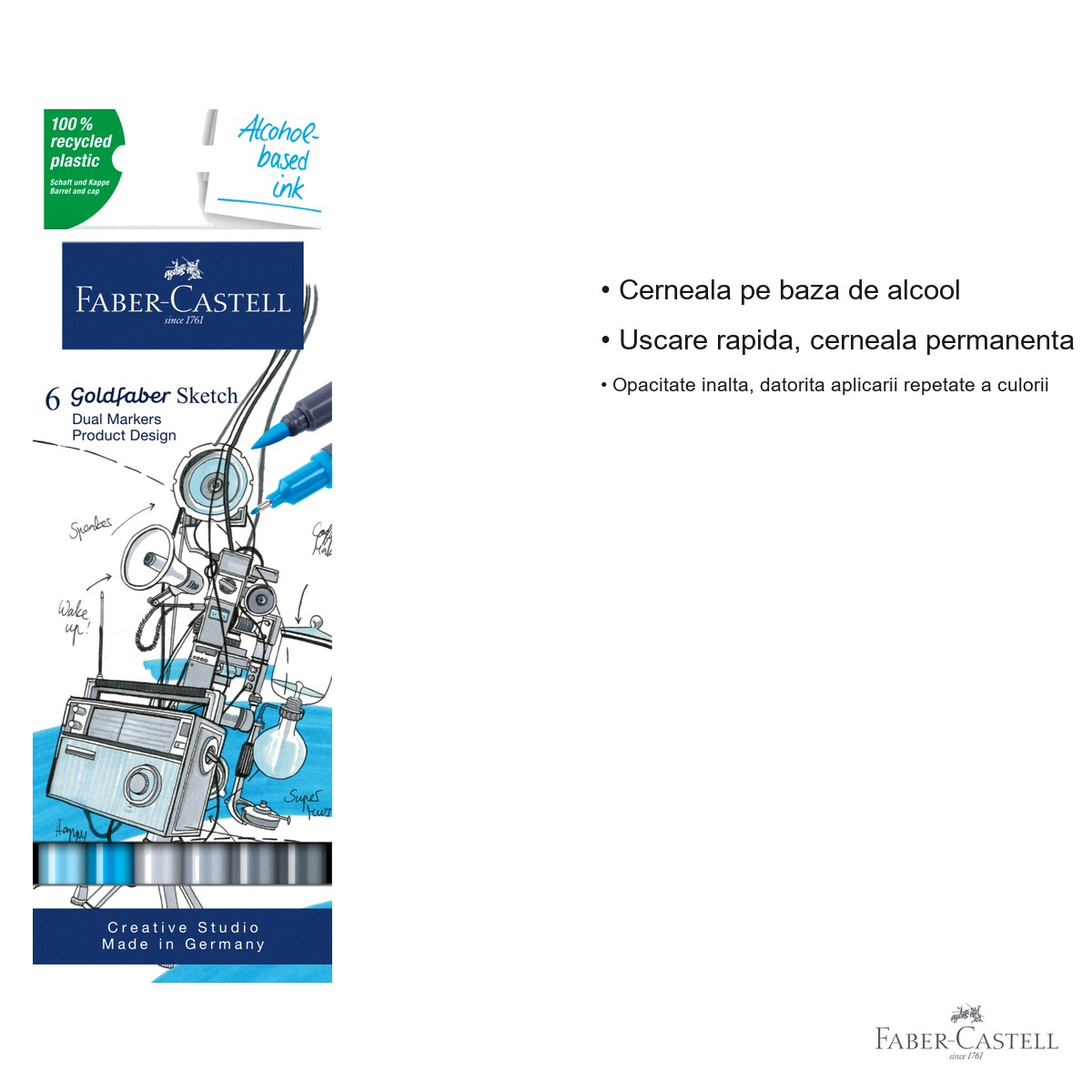 Setul de sketch markere Goldfaber Faber-Castell vine cu o serie de avantaje clare fata de produsele similare de pe piata. In primul rand, prezenta celor doua varfuri diferite intr-un singur corp elimina necesitatea de a schimba instrumentele in timpul lucrului, crescand eficienta si fluxul creativ. Varful pensula moale si flexibila permite trasaturi variabile ca grosime, ideale pentru efecte artistice expresive, in timp ce varful fineliner de 0.6 mm asigura linii precise si constante pentru contururi, texte sau detalii fine. Cerneala pe baza de alcool ofera uscare rapida, ceea ce reduce riscul de murdarie sau de stergere accidentala, iar opacitatea ridicata permite obtinerea de culori intense chiar si printr-un singur strat, cu posibilitatea intensificarii prin aplicari repetate. Un alt avantaj notabil este compatibilitatea culorilor din set, care pot fi combinate cu usurinta pentru a obtine gradiente, umbre si tranzitii de culoare fluente. Nu in ultimul rand, angajamentul Faber-Castell fata de sustenabilitate este vizibil in alegerea materialelor: corpul si capacele sunt fabricate integral din plastic 100% reciclat, facand din aceste markere o alegere responsabila fata de mediu.