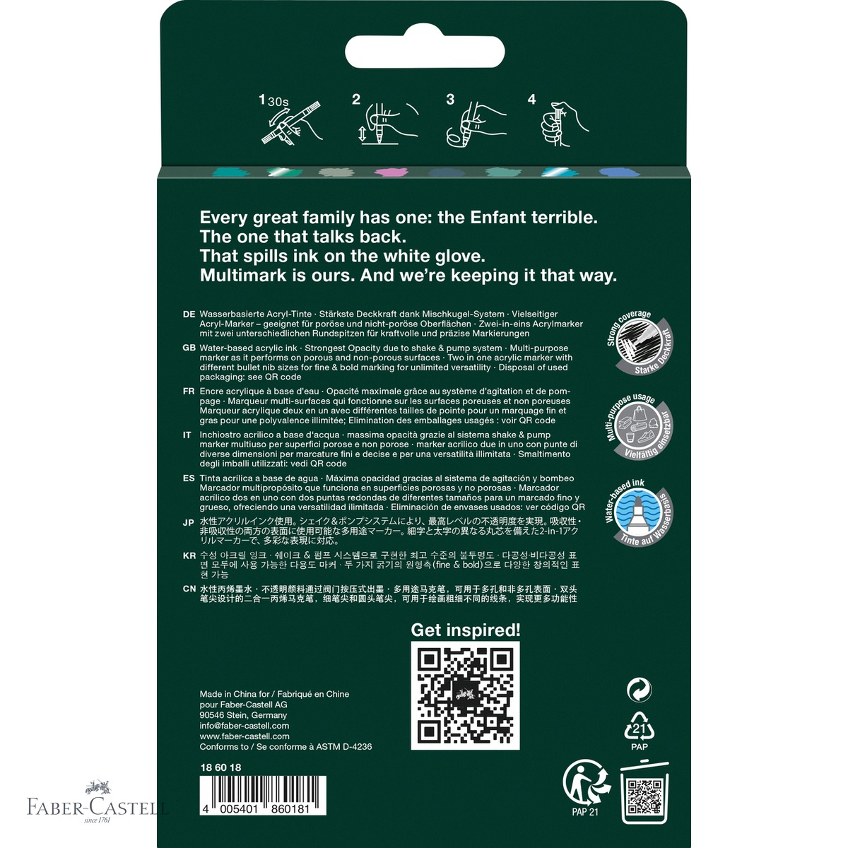Set de 8 markere acrilice cu tonuri reci Faber-Castell Multimark, cu varf dublu (gros 2-3 mm si fin 1-1,2 mm). Cerneala pe baza de apa, opaca, compatibila cu hartie, lemn, sticla, metal si alte suprafete.