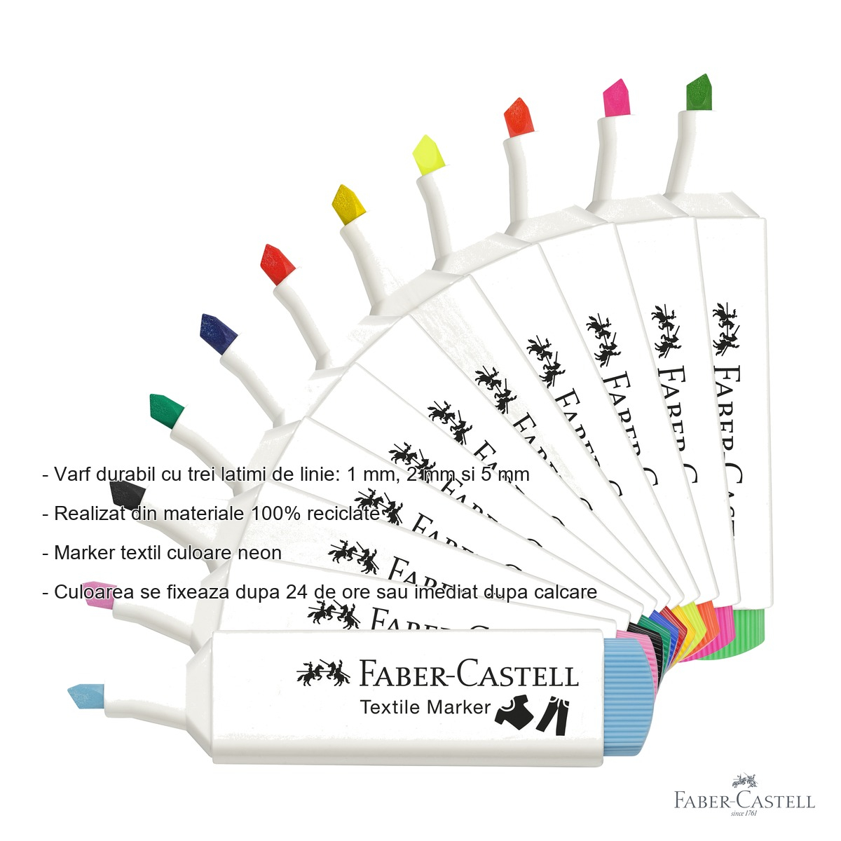 Markerul textil verde neon Faber-Castell aduce o serie de avantaje clare fata de produsele similare de pe piata. In primul rand, varful sau durabil este conceput sa reziste la utilizare intensa si sa nu se deterioreze rapid, asigurand linii precise si uniforme pe tot parcursul duratei de viata a markerului. Cele trei latimi de linie disponibile dintr-un singur varf (1 mm, 2 mm si 5 mm) ofera o flexibilitate exceptionala: poti alterna intre detalii fine si suprafete mai largi fara sa schimbi instrumentul. In al doilea rand, fixarea culorii este simpla si eficienta: lasi tesatura 24 de ore sau calci piesa cu fierul de calcat pentru o fixare imediata. Dupa fixare, culoarea devine rezistenta la spalare, pastrandu-si intensitatea pe termen lung. Nu in ultimul rand, faptul ca markerul este fabricat din materiale 100% reciclate il face o alegere responsabila fata de mediu, fara a compromite calitatea rezultatelor.