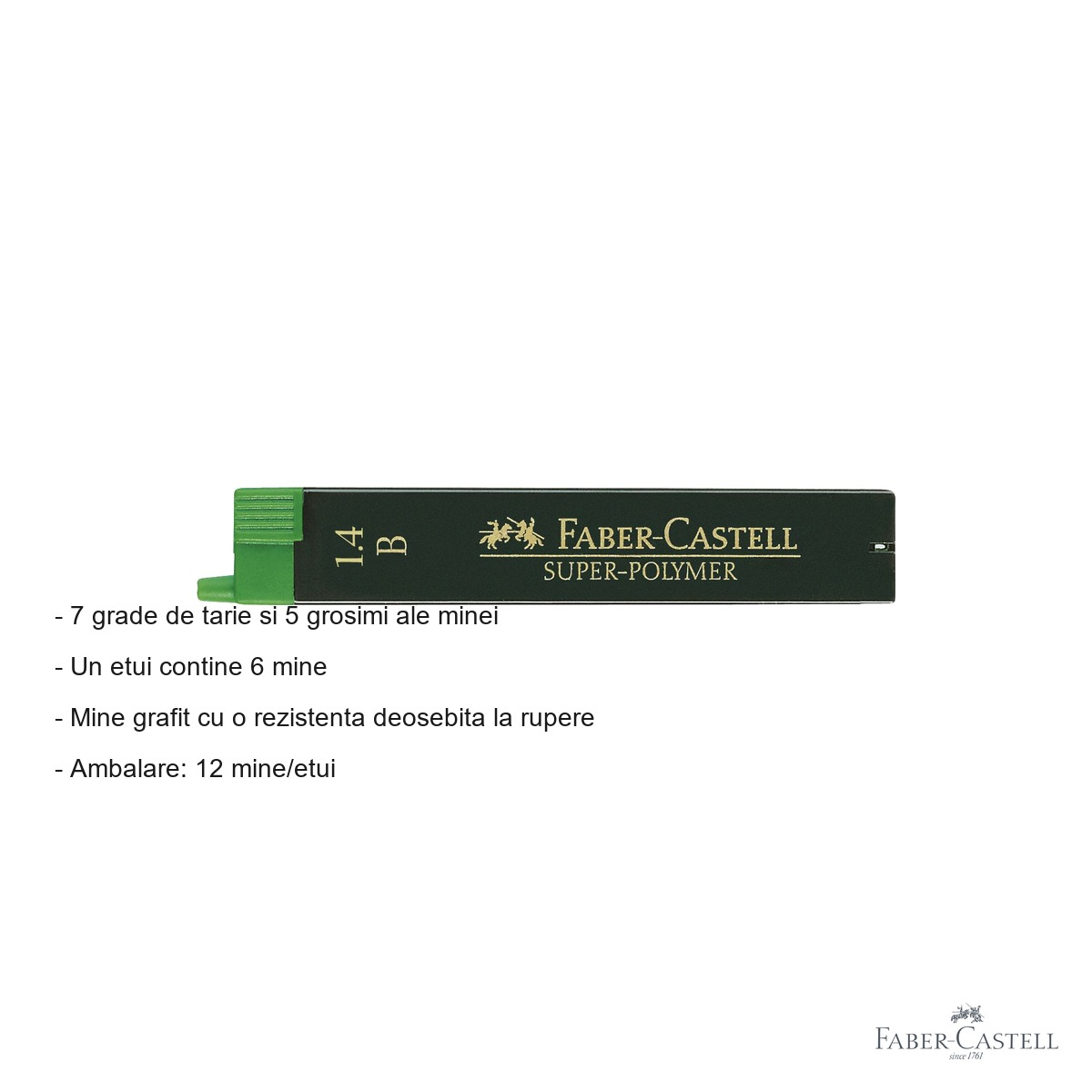 Minele Faber-Castell Super-Polymer sunt fabricate dintr-o formula speciala de grafit care le confera o rezistenta deosebita la rupere. Acest lucru inseamna mai putine intreruperi in timpul lucrului si o durata de viata mai lunga per mina. Linia obtinuta este neagra si intensa, ceea ce asigura o vizibilitate excelenta a scrisului sau a desenului, indiferent de tipul de hartie utilizat. Capacul etuiului este colorat in functie de grosimea minei, astfel incat identificarea rapida a minei potrivite devine extrem de simpla, mai ales atunci cand ai mai multe seturi de grosimi diferite. Compatibilitatea cu toate creioanele mecanice standard face ca aceste mine sa fie o alegere universala, fara limitari legate de marca creionului mecanic pe care il folosesti. Cu 12 mine intr-un singur etui, ai suficiente rezerve pentru o perioada indelungata, iar ambalajul practic permite inlocuirea minei rapid si fara efort.