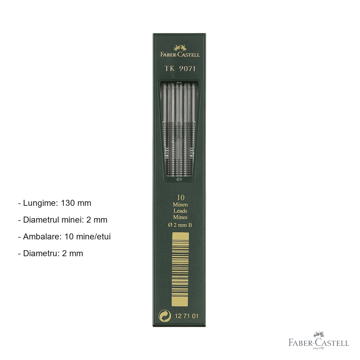 Minele grafit Faber-Castell TK cu duritate B ofera o serie de avantaje clare fata de minele standard disponibile pe piata. In primul rand, duritatea B inseamna un grafit mai moale, care lasa urme mai negre si mai vizibile pe hartie, ideal pentru cei care au nevoie de contrast ridicat in lucrarile lor. In al doilea rand, diametrul de 2mm asigura o rezistenta sporita la rupere in comparatie cu minele mai subtiri, ceea ce le face potrivite pentru un ritm intens de lucru. Lungimea de 130mm garanteaza o autonomie extinsa inainte de a fi necesara inlocuirea. In plus, grafit-ul de inalta calitate permite stergerea curata si eficienta, fara a lasa urme sau a deteriora suprafata hartiei. Ambalajul etui cu 10 mine asigura un stoc convenabil, usor de transportat si depozitat.