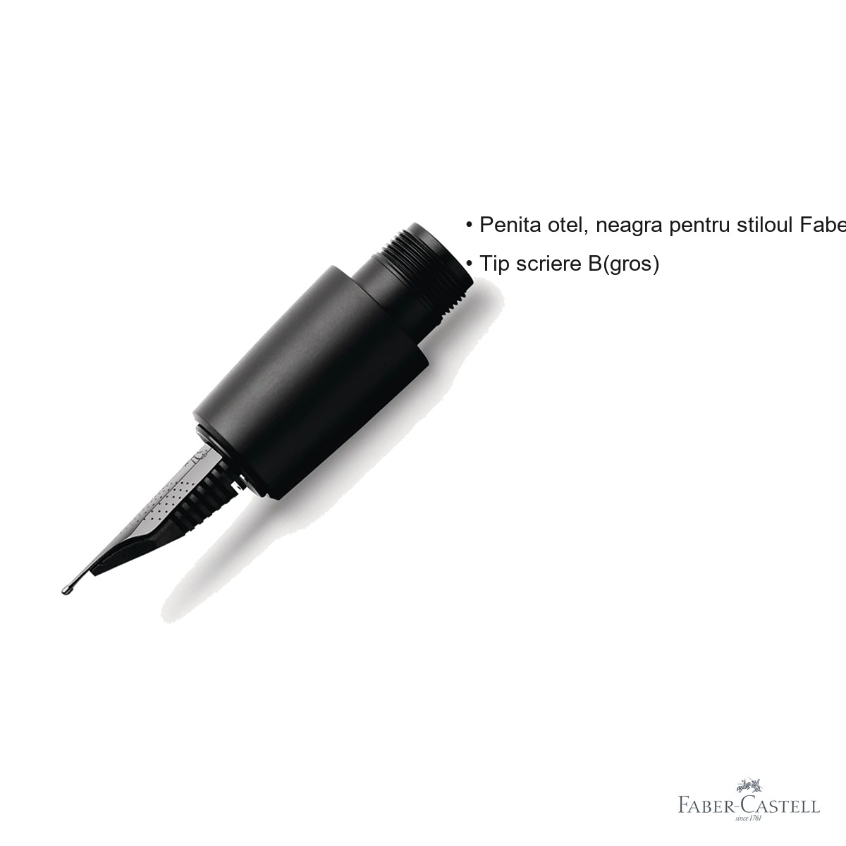 Aceasta penita este recomandata exclusiv pentru stiloul Faber-Castell E-motion Pure Black. Inainte de montare, asigurati-va ca stiloul este golit de cerneala si curatit corespunzator. Penita tip B (scriere groasa) functioneaza cel mai bine pe hartie de calitate medie sau superioara, care absoarbe cerneala uniform si previne extinderea excesiva a traseului. Pentru o experienta optima, folositi cerneala Faber-Castell sau cerneala compatibila, de calitate. Evitati presiunea excesiva pe penita in timpul scrierii, deoarece stilourile premium sunt concepute pentru un contact usor, natural cu suprafata hartiei. In cazul in care penita prezinta probleme de curgere a cernelii, se recomanda curatarea cu apa calda inainte de reutilizare.