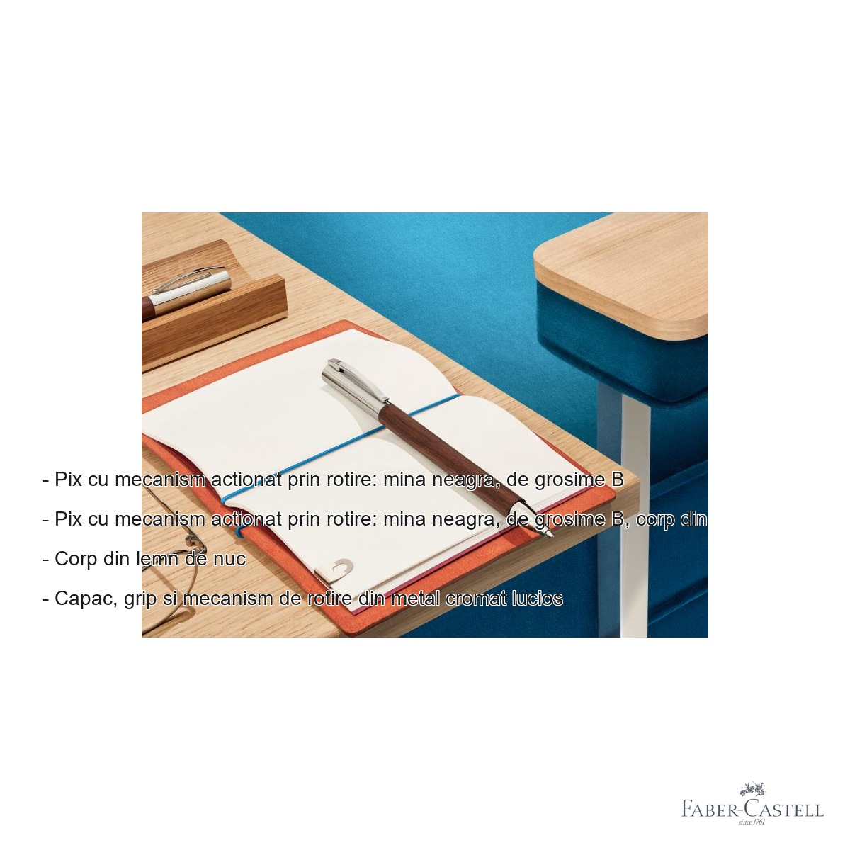 Corpul din lemn de nuc al acestui pix nu este doar o alegere estetica - lemnul de nuc este recunoscut pentru durabilitatea sa, pentru caldura la atingere si pentru aspectul sau nobil, cu fibre si nuante usor diferite de la un exemplar la altul. Aceasta inseamna ca fiecare pix Ambition Walnut Wood este, intr-o anumita masura, unic. Accesoriile din metal cromat lucios completeaza perfect naturaletea lemnului, creand un contrast vizual elegant care atrage atentia in orice context.